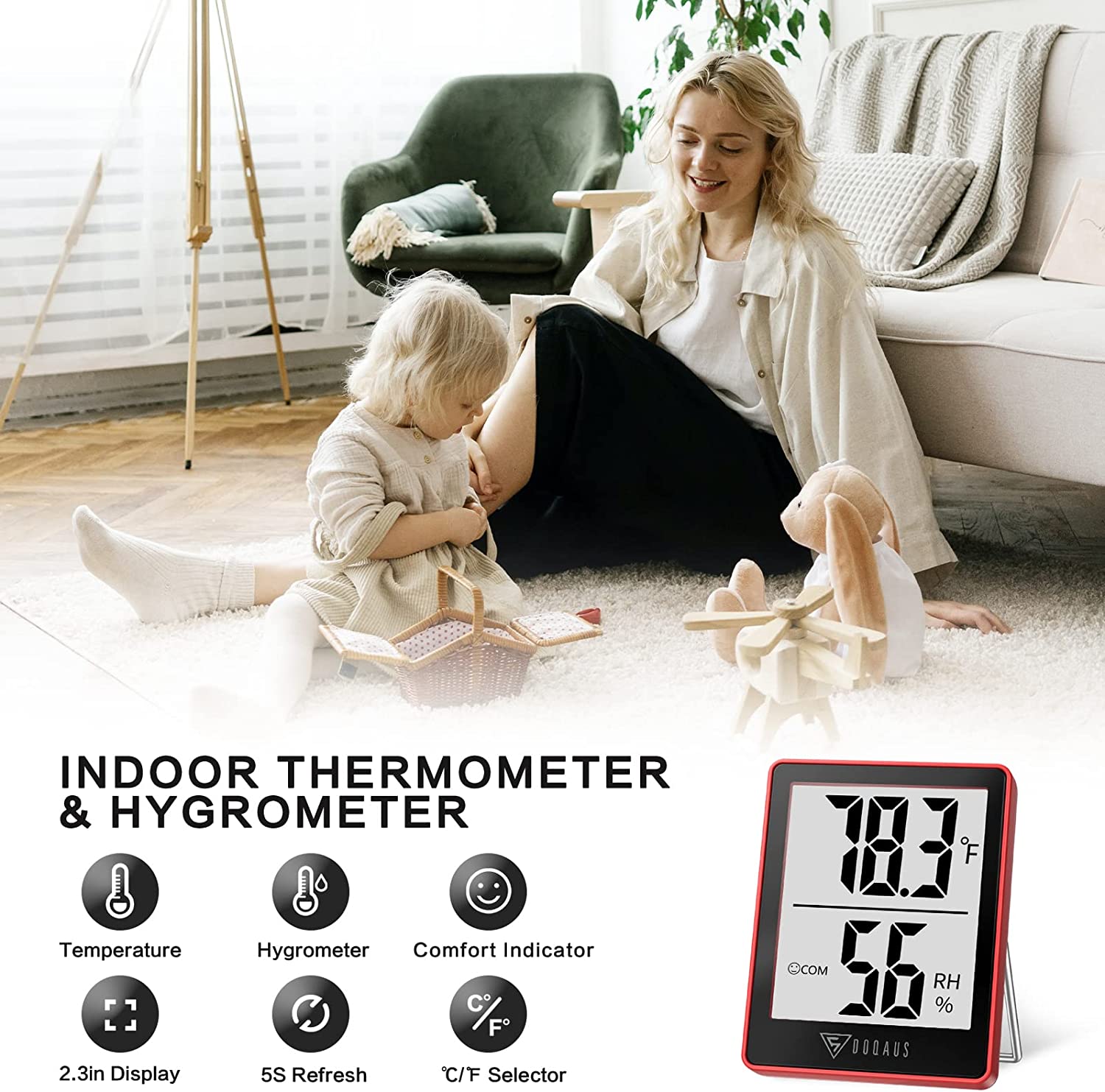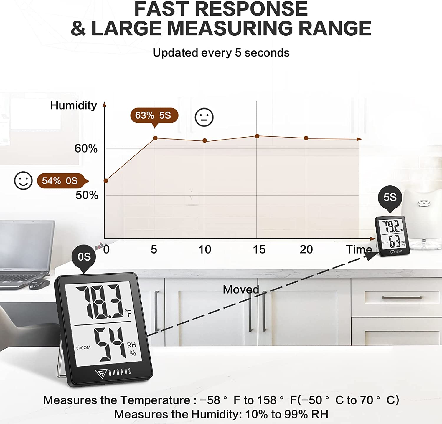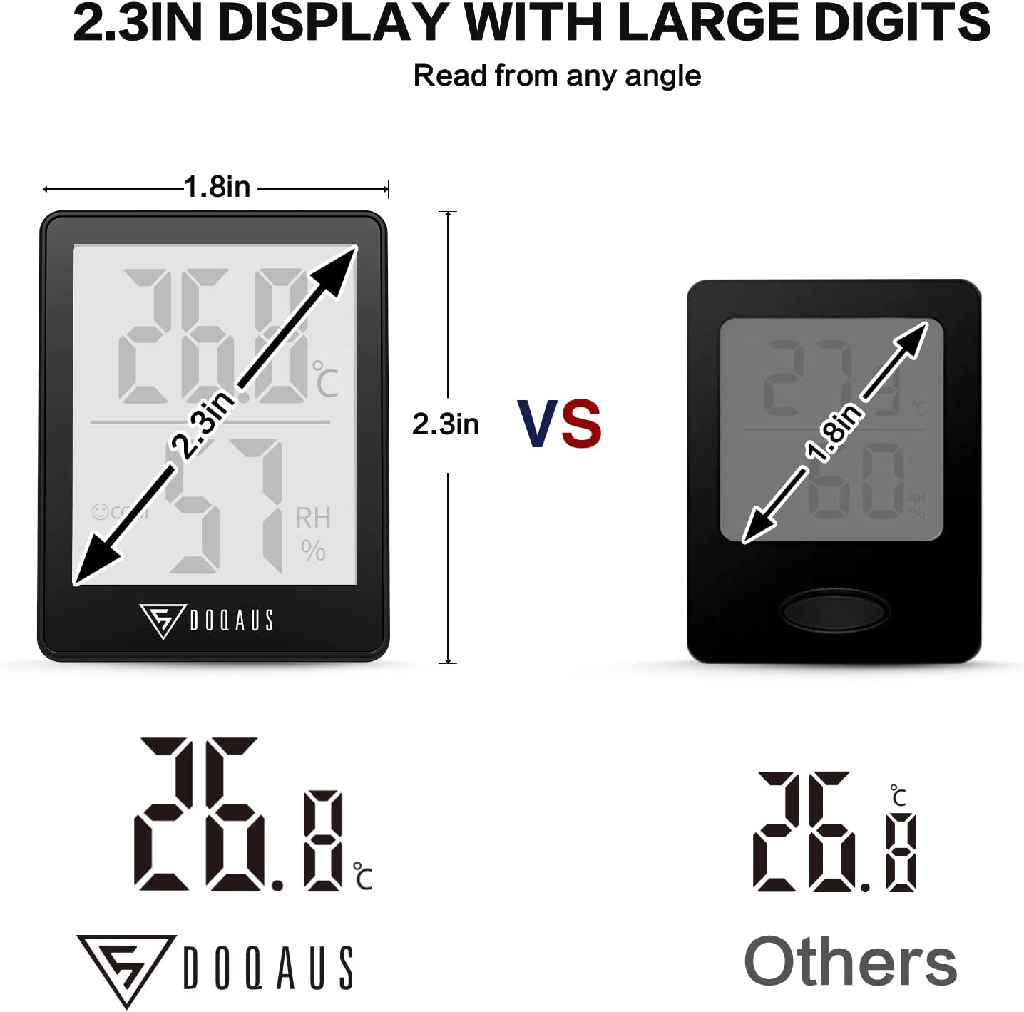 [Air Comfort Indicator]: DOQAUS thermometer for home features 3 different face icons to indicate DRY/COMFORT/WET air condition. Remind you to adjust your humidifier or dehumidifier accordingly and help you will always live in the most comfortable environment.