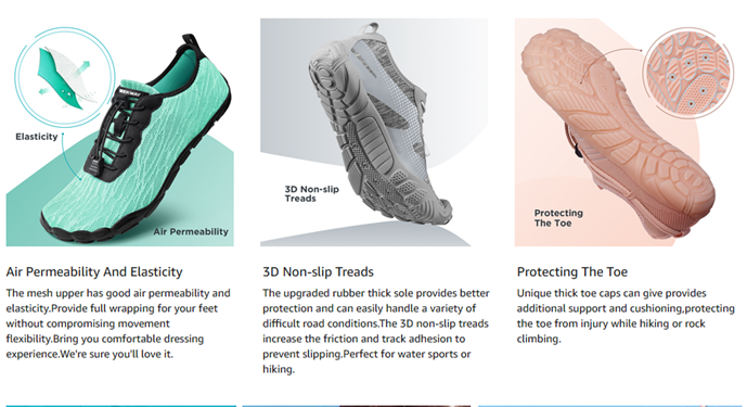 All-round Protection:Thick rubber soles and a toe cap keep your feet completely protected from sharp objects and provide great cushioning. The 3D non-slip treads provide exceptional grip even in slippery conditions. This makes it a great choice for outdoor sports.