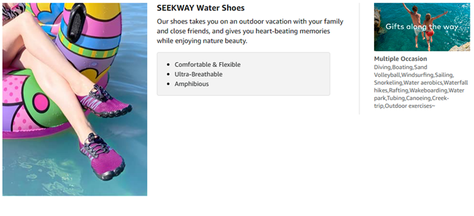 Breathing shoes:The shoe was designed to be ultra-breathable: Spandex vamp has tiny air holes for quick drying and the outsoles、insoles are designed with drainage holes to drain the water.This forms a perfect breathing system that keeps your feet cool and dry, from the inside to the outside.