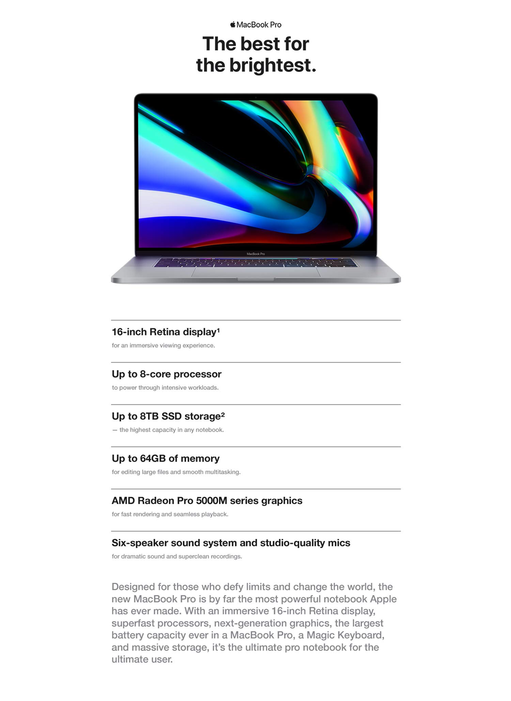 | In the Box | 16-inch MacBook Pro, 96W USB-C Power Adapter, USB-C Charge Cable (2 m) |