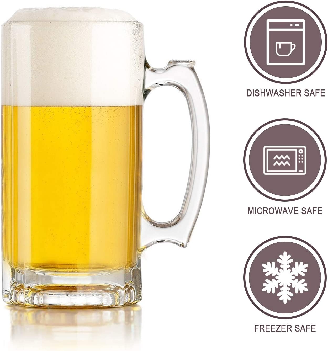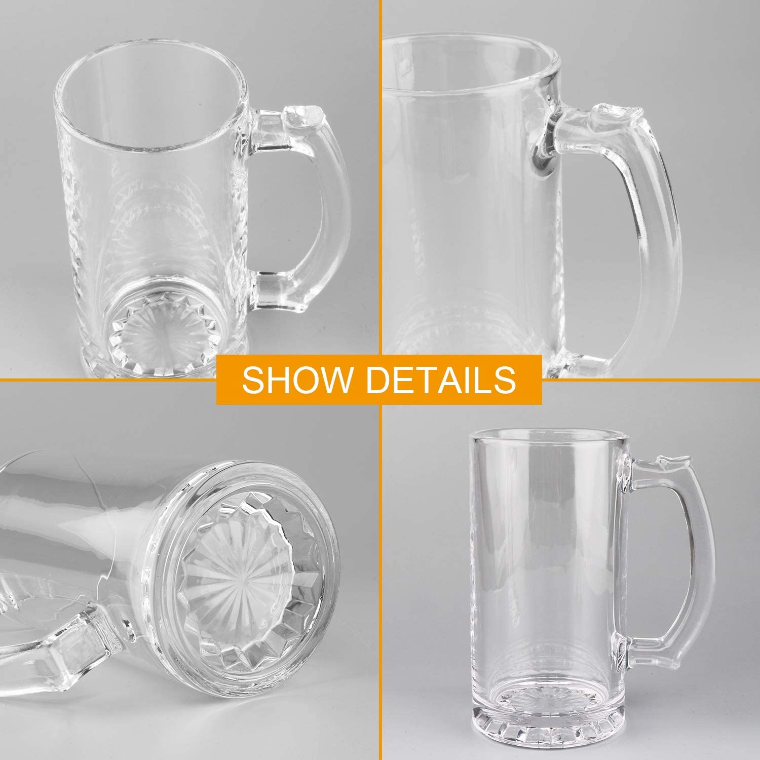 • Classic Design:Easy hold handle design which is easy to take up and down,feeling no heavy with beer full inside!heavy base,clear glass,round tall looking is so elegant and saft to use,cylindrical shape,wide handle,thick,everything is excellent on it !