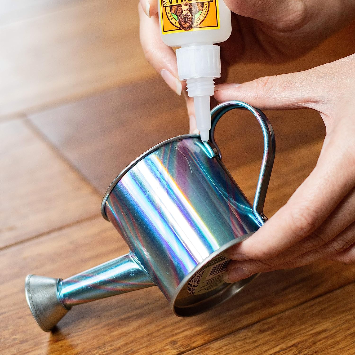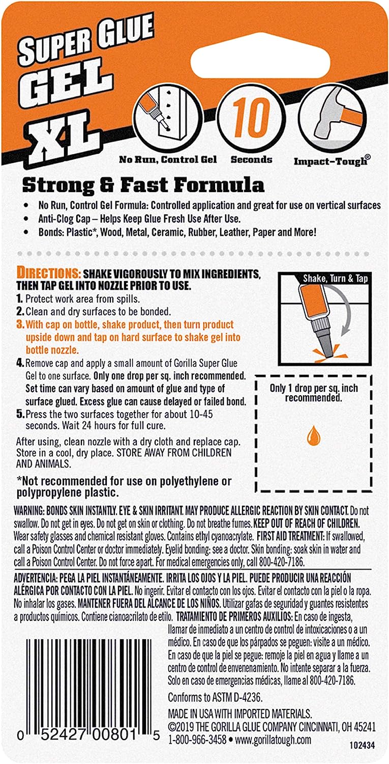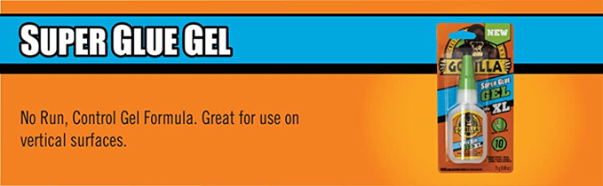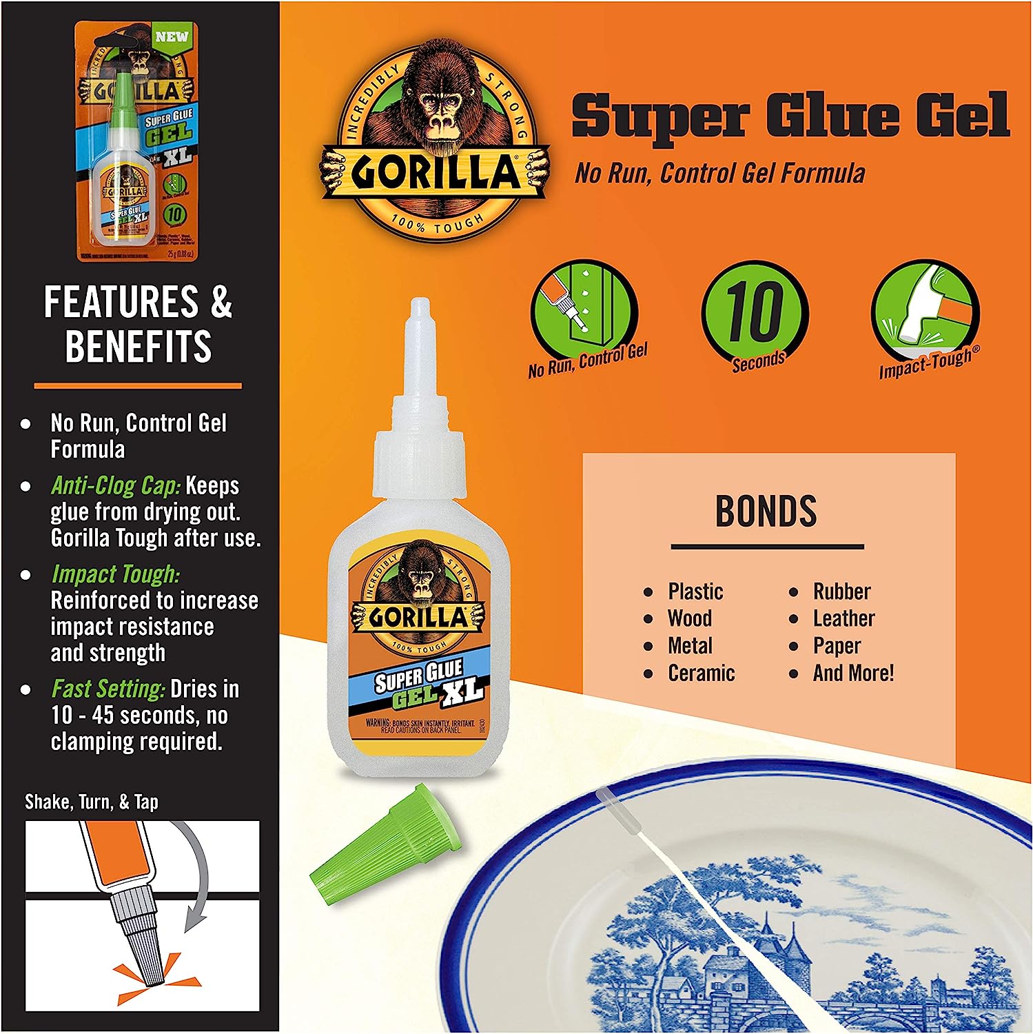 Gorilla Super Glue Gel is an easy-to-use, thicker and more controlled formula* great for multiple surfaces and vertical applications. Developed for long-lasting repairs in an instant, the clear glue dries in 10-45 seconds. This super glue gel is specially formulated to absorb drops and impacts. Super glue, also referred to as cyanoacrylate glue, or CA glue, works on a variety of materials, including plastic**, metal, stone, ceramic, paper, rubber and more. In addition to its high-performance formula, we've added an anti-clog cap with a metal pin inside to ensure an airtight seal for maximum reusability. It's Gorilla tough, every time.
