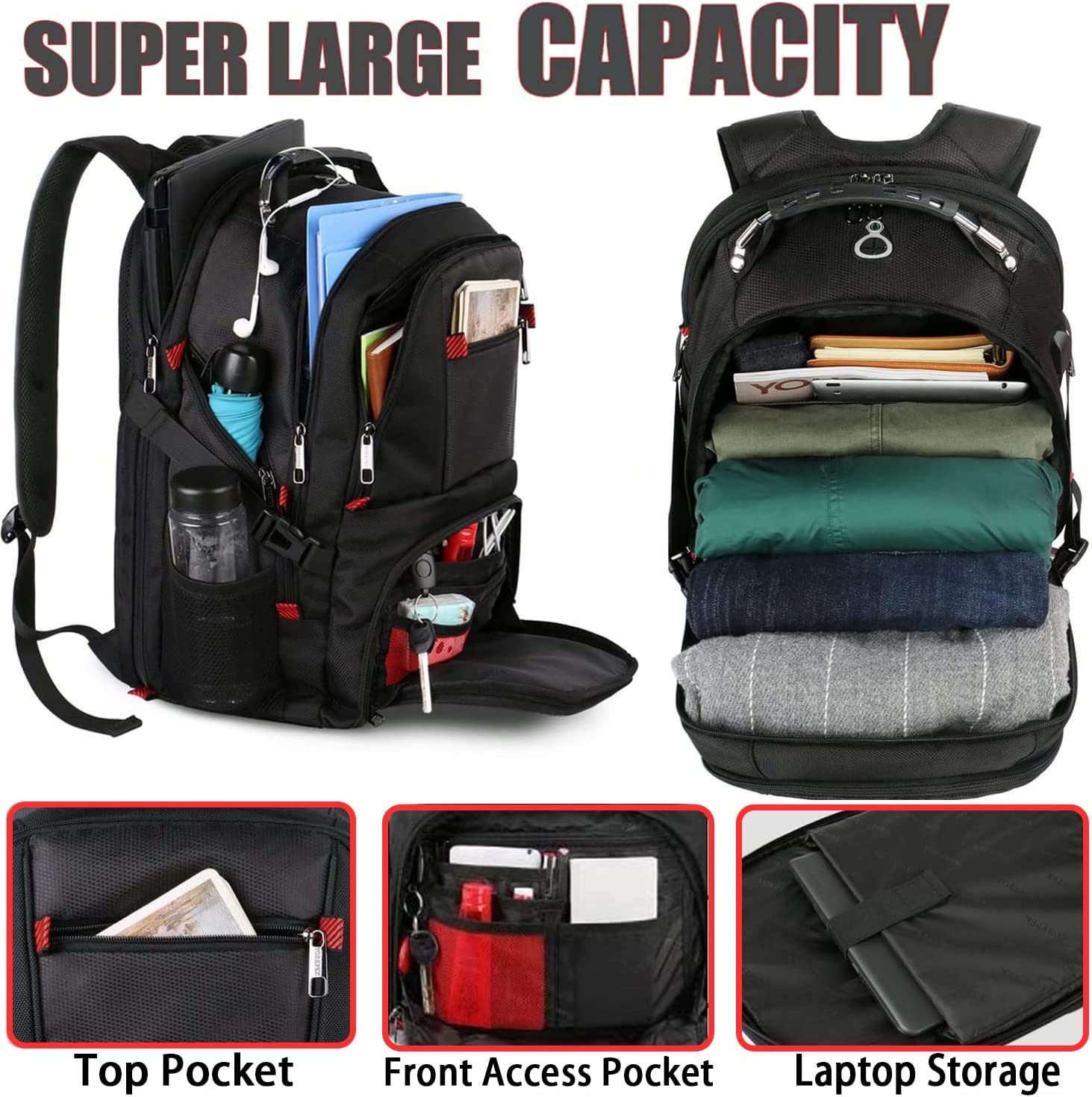 Large Capacity & Organized: The large backpack owns 3 spacious compartments-one separate laptop compartment that fits 17-inch laptops, and one main compartment roomy for daily necessities, such as clothes, notebooks, etc. The front compartment has many small pockets, as well as pen pockets and a keychain design to keep your things organized. The large backpack for men has 10+ pockets, including 2 side mesh pockets for water bottles and umbrellas. Size: 18"x13.5"x6.5"