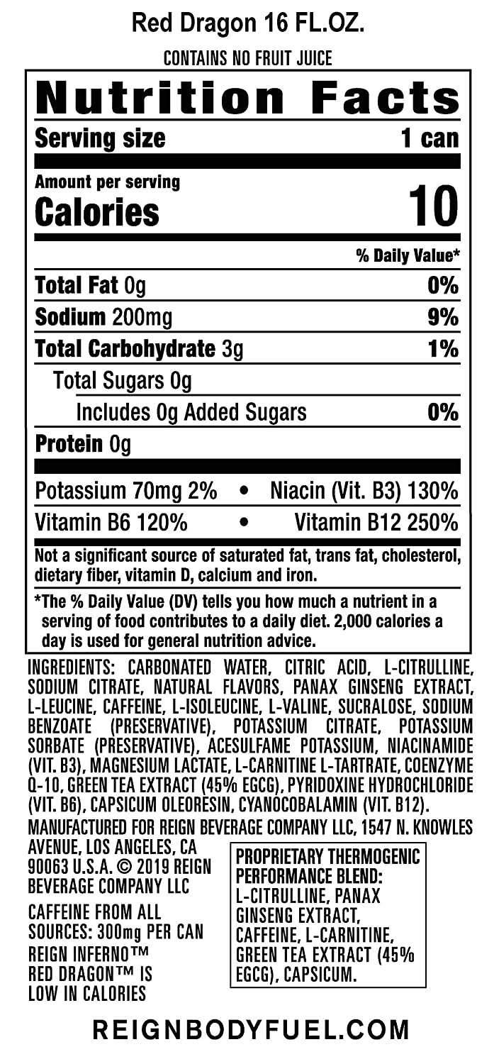 THERMOGENIC PERFORMANCE BLEND: Reign Inferno’s proprietary thermogenic performance blend includes 300mg of Natural Caffeine, L-Citrulline, Panax Ginseng Extract, L-Carnitine and Green Tea Extract. Thermogenic ingredients increase metabolic energy levels to produce heat, which burns calories in combination with exercise and a healthy diet. Reign Inferno also contains the same attributes as Reign Total Body Fuel - Zero Sugar, BCAA’s, CoQ10, Electrolytes, B Vitamins (B3, B5 and B12), No artificial colors, flavors or fat.