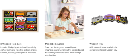 All aboard for some railroad adventures! Eight wooden train cars, each approximately three inches long, link together with magnetic couplers in endless combinations for lots of imaginative play. Brightly painted and beautifully crafted train cars include a steam engine, caboose, coal car, passenger car, and more. This set is sized to play perfectly with Melissa & Doug activity rugs or on its own. Pieces all store neatly in the compartmentalized wooden tray. This Melissa & Doug wooden toy set is made from high-quality materials. The sturdy train cars set provides unloading fun, and it’s easy for younger kids to use. Magnetic couplers link the cars together smoothly, making this a great toy set for building fine-motor skills and hand-eye coordination. This set makes a great gift for kids ages 3 years old and up, inspiring hours of hands-on, screen-free play. The Melissa & Doug Round the Rails Train Rug is a great add-on to give kids a dedicated space for imaginative play. For more than 30 years, Melissa & Doug has created beautifully designed imagination- and creativity-sparking products that NBC News called “the gold standard in early childhood play.” Today, Melissa & Doug is proudly partnering with the American Academy of Pediatrics to foster early brain development and help children build important life skills through play.