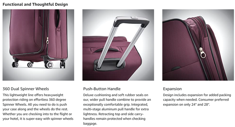 - FOUR, MULTI-DIRECTIONAL OVERSIZED DUAL SPINNER WHEELS for effortless mobility, re-engineered lightweight