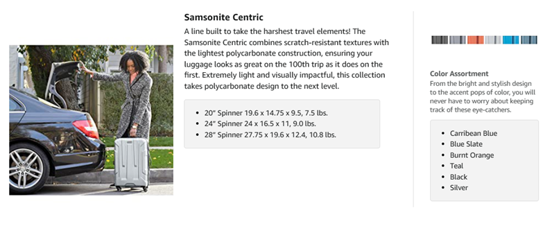 Centric combines scratch-resistant textures with lightweight 100% polycarbonate construction, ensuring your luggage looks as great on the 100th trip as it does on the first. This lightweight line offers heavyweight protection riding on effortless 360° Spinner Wheels. Don’t pull your case; let Centric roll comfortably beside you on your journey. Design includes expansion for added capacity when needed. TSA locks help to protect your belongings.