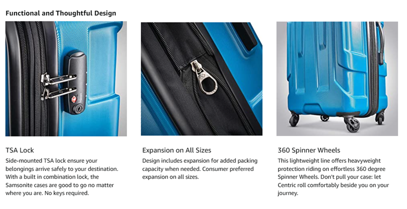 - FOUR, MULTI-DIRECTIONAL OVERSIZED SPINNER WHEELS for effortless mobility, re-engineered lightweight