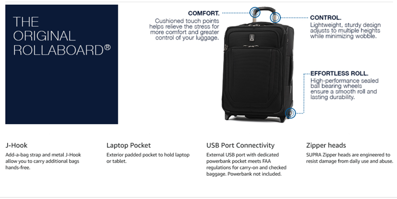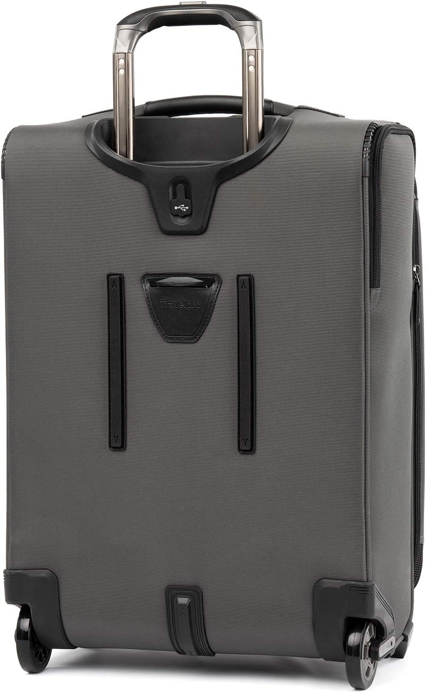 Pack to the max with luggage that is truly all your own. The max carry-on expandable Rollaboard is designed for total packing versatility and customizable with a variety of interchangeable Travelpro exclusive zip-in organizers. Included inside the lid is a removable zip-in garment organizer, ideal for storing folded shirts, dresses and jackets. Also available for purchase separately are four additional coordinating Travelpro exclusive zip-in organizers-a laundry organizer for bathing suits, workout clothes and other damp items, A packing cubes organizer for shorts, shirts and accessories, A suitor organizer to keep hanging clothes wrinkle-free and an all-in-one organizer for wet and dry storage (each sold separately). created for domestic travel on larger aircraft, this bag is sized to max out the sizer bin and fit In the overhead bins of most major yours. Airlines. It also features a tip-resistant zippered expansion to increase packing space up to two inches, but be careful not to overpack the exterior pockets and risk making it too big for the sizer bin. Enjoy total convenience with a built-in USB port and dedicated exterior power bank pocket, exterior padded laptop pocket and removable TSA-compliant toiletries bag that stores perfectly in a same-sized exterior pocket. Two ultra-strong, oversized, high-performance ball bearing wheels roll smoothly over any terrain led by a four-stop, height-adjustable PowerScope handle, while the add-a-bag strap and metal j-hook let you carry additional bags hands-free. Built for professional-grade dependability With robust corner armor, skid guards and heavy-duty wheel housings, crew versapack is the civilian version of the luggage flight crews use, tested to meet the same superior quality and durability standards. This Rollaboard is further backed by the comprehensive built for a lifetime limited warranty with our trusted companion promise.