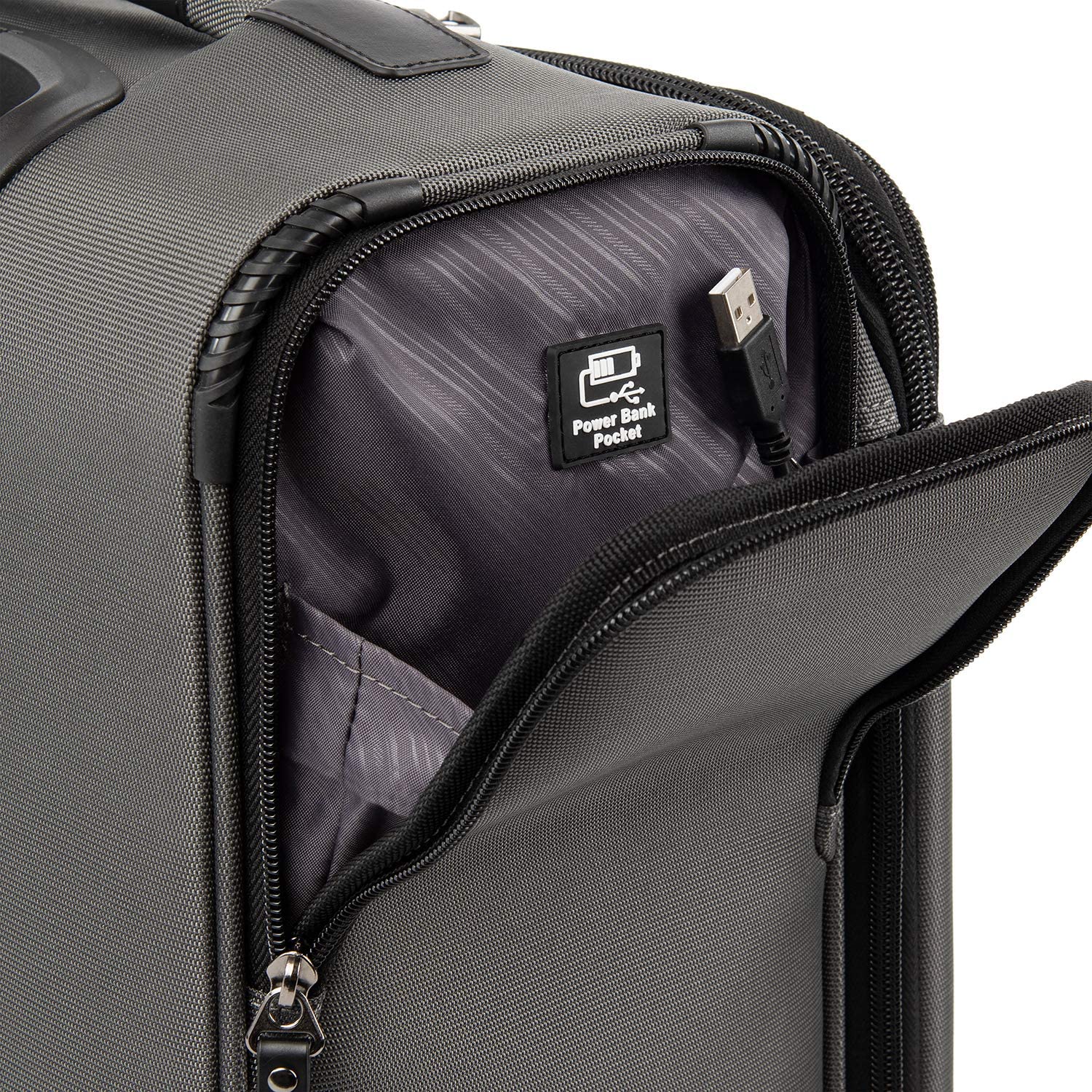 • External USB port provides access to power on the go. Exterior power bank pocket provides FAA-compliant power connected to an external USB Port (battery not included). Exterior, padded pocket fits laptops up to 17".