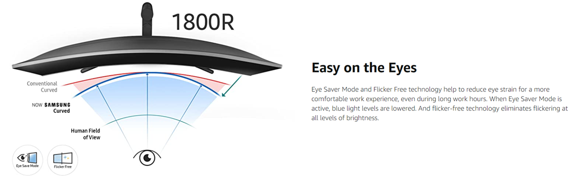 Samsung’s ultra-curved 1800R VA panel is designed for comfort and productivity. With an 1800mm radius, the distance from screen to eye maintains a more uniform distance, helping to reduce eye fatigue when working long hours.