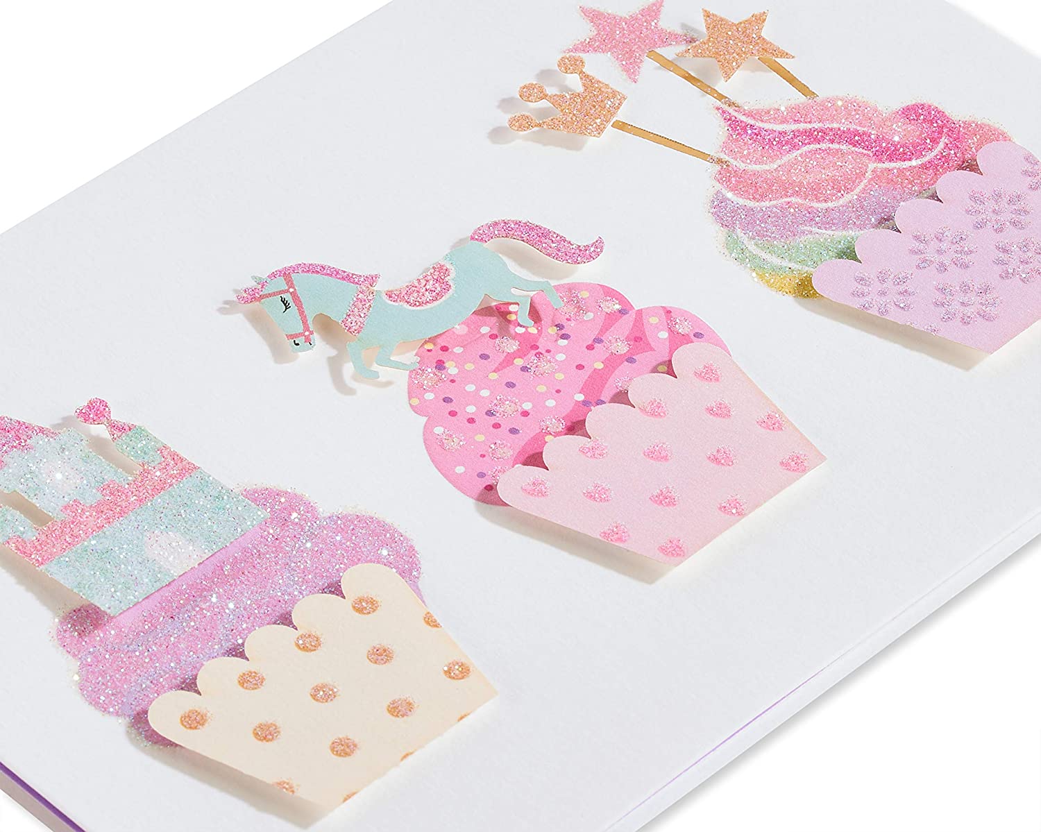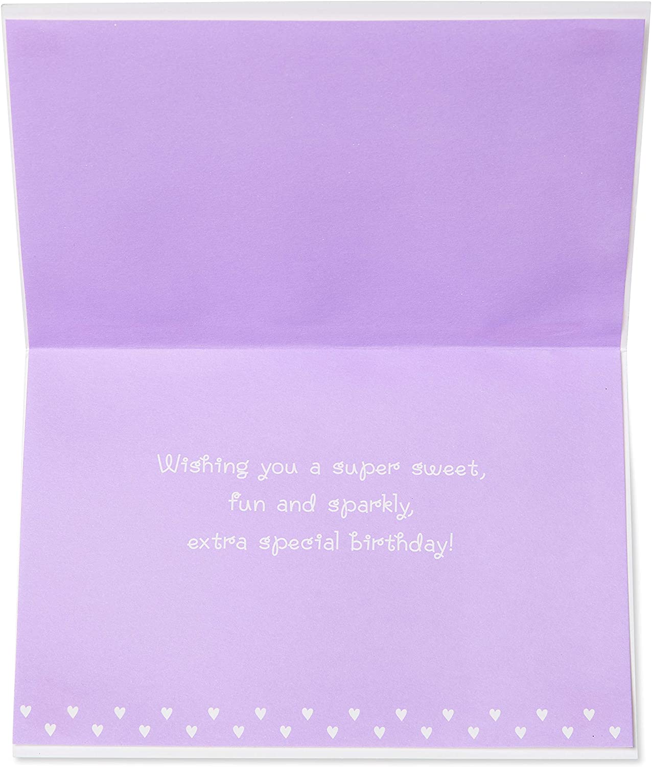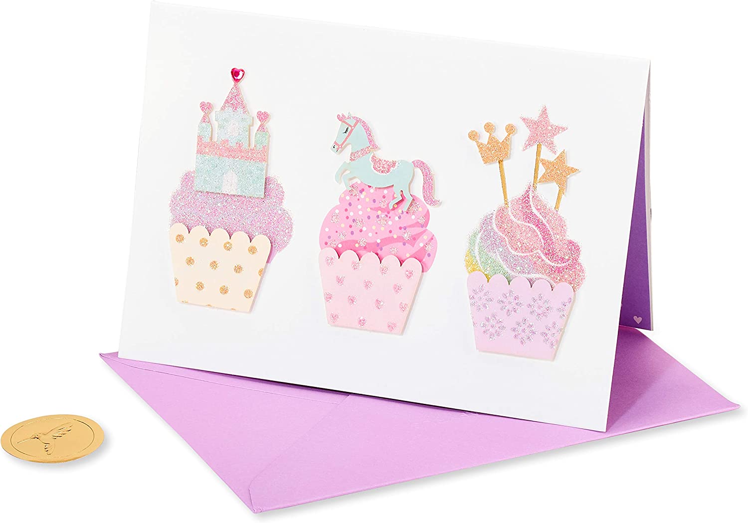 Choose Papyrus for the birthday princess in your life This sweet pastel design of glittery cupcakes is topped with paper attachments of a castle, unicorn, and other fairy tale items. Gems, layered-paper attachments, and glitter highlights bring just the right amount of birthday magic. Inside, an extra special message stands out against a lilac purple background with white heart border. Finish the card with the lilac envelope, featuring a patterned liner of castles and crowns, and a signature Papyrus gold foil seal, and you are ready to make someone smile Just remember, extra postage is required