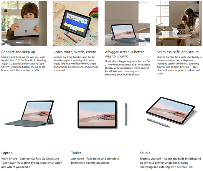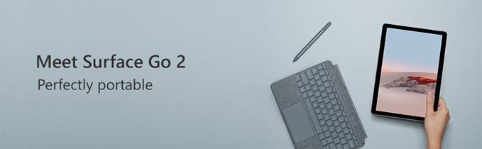 New 10.5” Surface Go 2 is perfect for keeping up and winding down — delivering tablet portability with laptop versatility, long battery life, a stunning touchscreen, and Windows security for the whole family. Browse, shop, and manage email with ease, relax with your favorite TV shows, and much more.