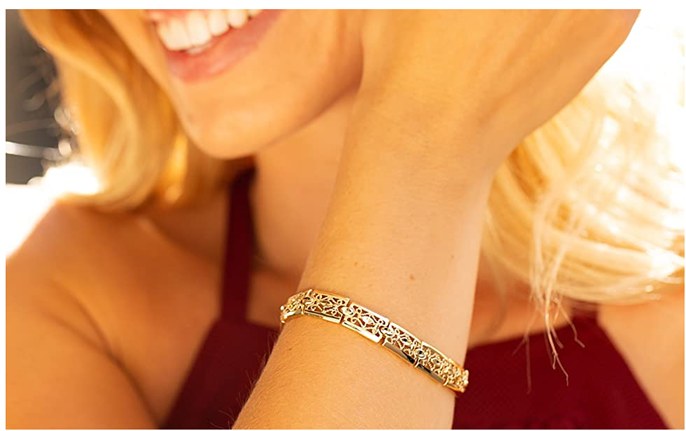 ? This 9mm ( ~ 3/8 inch ) Filigree Bracelet for women is MADE TO LAST with up to 20X more 24 karat gold plating than other electroplated fashion jewelry; This elegant bracelet makes a statement with its intricate and delicate design; Choice of yellow or white gold (rhodium)