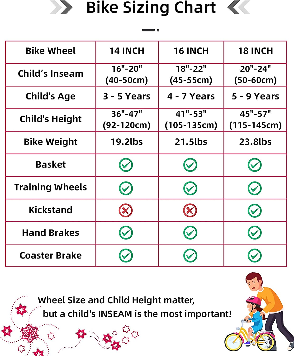 - ✔ALWAYS ON YOUR SIDE - 14 inch bike is suitable for 3-5 years old (35"-47") girls; 16 inch bike is suitable for 4-7 years (41"-53") girls; 18in bike is suitable for 5-8 years (45"-57"). Adult assembly is required. The bike comes with 85% assembled body and the basic assembly tools, timely customer service and also limited lifetime warranty.