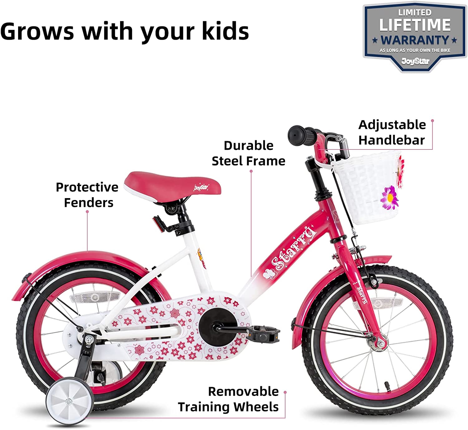 - ✔Designed for Kids - JOYSTAR Starry 14inch Girls bikes are designed for children ages 3-5 years old or 35-47inches tall. The Starry features a durable and light steel frame, easy-to-steer handlebars, and an adjustable seat. The Starry is perfect for riding to the park or riding on the sidewalk around the neighborhood.