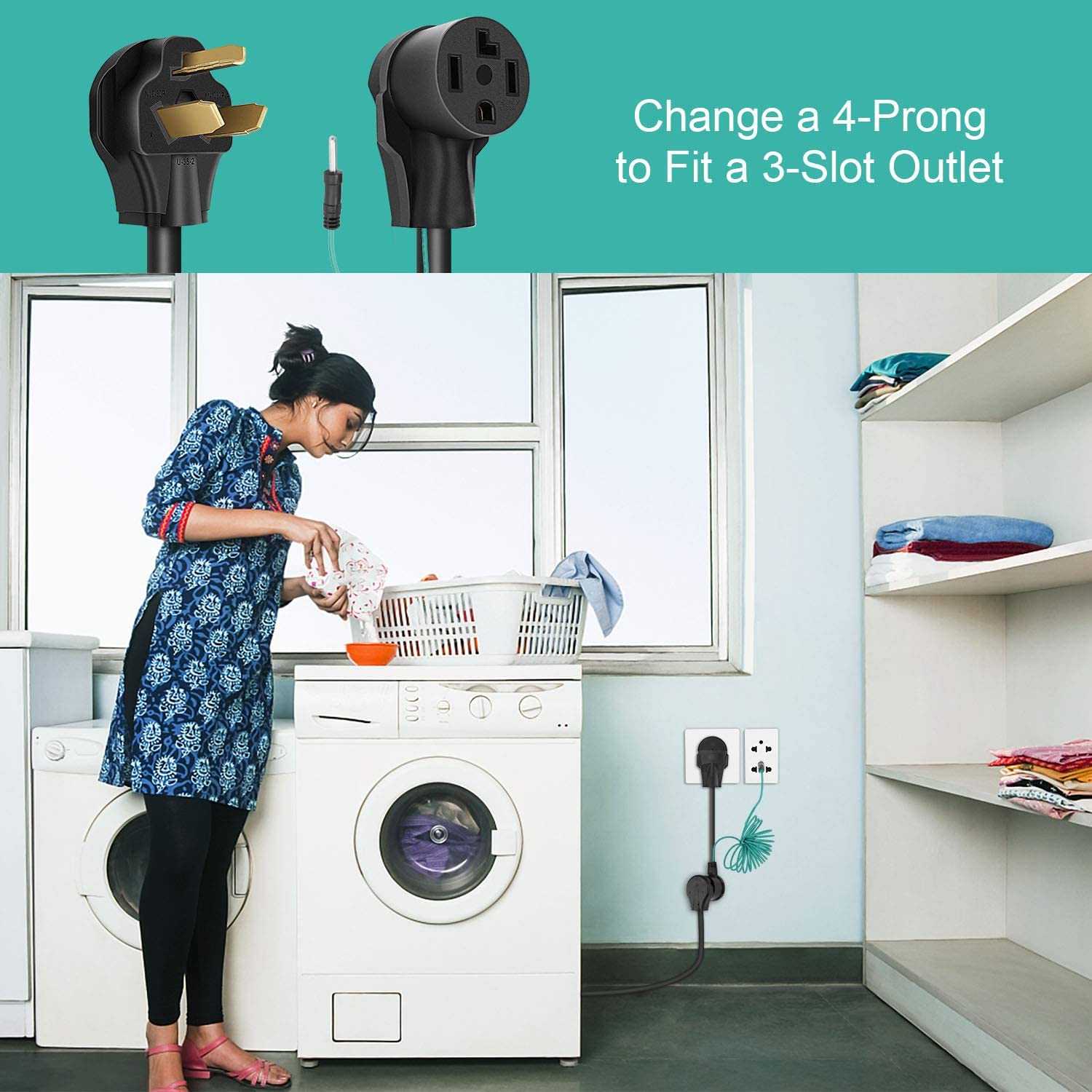- Dryer Adapter Cord: Connect the 3 prong Nema 10-30P male plug to the female wall outlet of Nema 10-30R, and plug your dryer 4 prong Nema 14-30P plug to the female cable socket (Nema 14-30R).