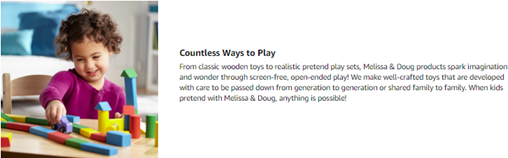 From classic wooden toys to crafts, pretend play, and games, Melissa & Doug products provide a launch pad to ignite imagination and a sense of wonder in all children so they can discover themselves, their passions, and their purpose.Since the company’s founding more than 25 years ago, Melissa & Doug has consistently delivered innovative products that inspire open-ended thinking, encourage kids to see new possibilities, and offer Countless Ways to Play. It’s part of a bigger vision to Take Back Childhood. Because by giving children a true childhood with the space and freedom to explore their world, we give them a path to realizing their full potential!