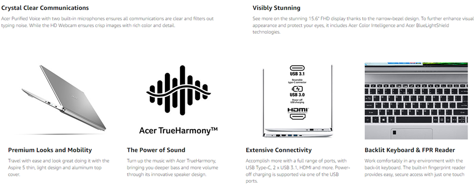 Acer Aspire 5 A515-55-56VK comes with these high level specs: 10th Generation Intel Core i5-1035G1 Processor 1.0GHz with Turbo Boost Technology up to 3.6GHz (6MB Smart cache), Windows 10 Home, 15.6" Full HD (1920 x 1080) widescreen LED-backlit IPS Display, Intel UHD Graphics, 8GB DDR4 Memory, 256GB PCIe NVMe SSD, 1 - Available Hard Drive Bay, True Harmony Gen 2 Technology, Two Built-in Stereo Speakers, Acer Purified.Voice Technology with Two Built-in Microphones, Intel Wireless Wi-Fi 6 AX201 802.11ax Dual-Band 2.4GHz and 5GHz featuring 2x2 MU-MIMO technology (Max Speed up to 2.4Gbps), 10/100/1000 Gigabit Ethernet LAN (RJ-45 port), Bluetooth 5.0, Back-lit Keyboard, Acer Fingerprint Reader supporting Windows Hello, HD Webcam (1280 x 720), 1 - USB 3.1 (Type-C) Gen 1 port (up to 5 Gbps), 2 - USB 3.1 Gen 1 Port (one with Power-off Charging), 1 - USB 2.0 Port, 1 - HDMI Port with HDCP support, Lithium-Ion Battery, Up to 8-hours Battery Life, 3.97 lbs. 1.8 kg (system unit only) (NX.HSPAA.004).