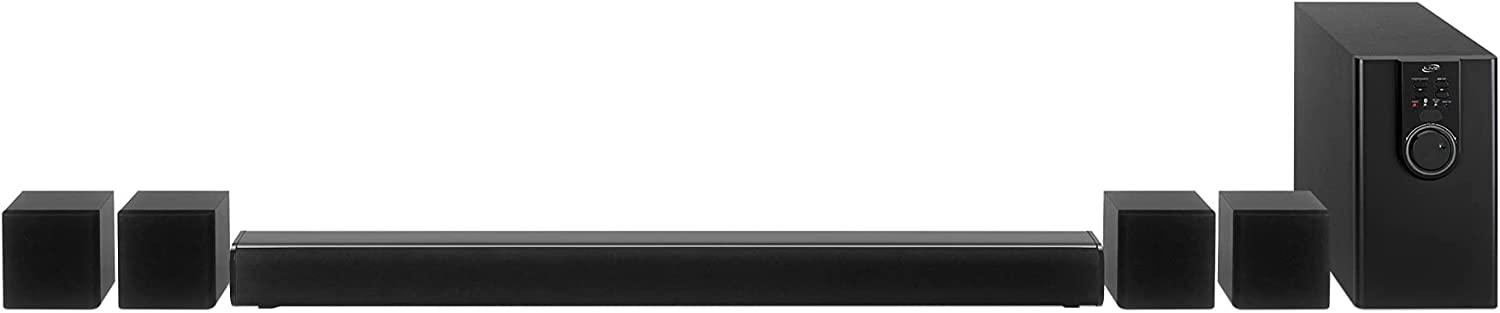 Complete your home theater experience with stunning sound from the iLive 5.1 Home Theater System with Bluetooth. This 5.1 channel powered speaker system includes a subwoofer, 32 in. speaker bar, and 4 satellite speakers. Voice prompts announce speaker functions and make Bluetooth pairing easier. With a wireless range of 60 feet, this home theater system is wall mountable (hardware and instructions included). AC/DC power adapter, remote, optical audio cable, 3.5mm to RCA audio cable, and 3 RCA stereo audio cables included.