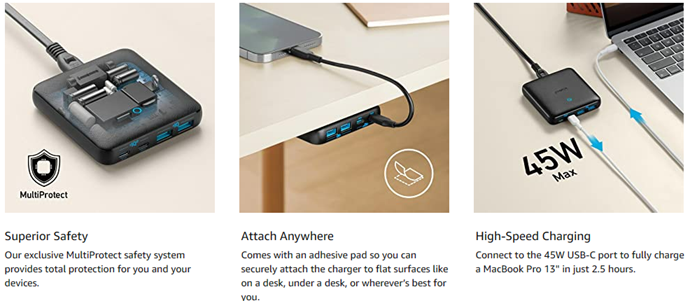 45W USB-C Port: 45W Max (when other ports are free); 18W USB-C Port: 18W Max; Dual USB-A Ports: Share 15W