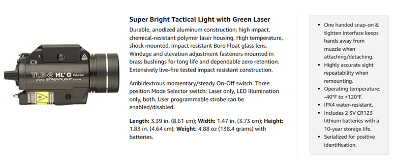 The TLR 2 HL G with green laser provides an 1000 lumen blast of light for maximum illumination while clearing a room or searching an alley. Its wide beam pattern lights up large areas so you can identify who or what is nearby. LED technology, impervious to shock with a 50,000 hour lifetime; 510 530nm direct drive green laser with wide operating temperature range. 800 lumens; 15,000 candela peak beam intensity; 245m beam; runs 1.5 hours (Laser/LED simultaneously); Laser only function runs 17 hours. Engineered optic produces a concentrated beam with optimum peripheral illumination. Green laser provides high visibility long range targeting. Powered by two 3 Volt CR123 lithium batteries with 10 year storage life. Rail grip clamp system securely attaches/detaches quickly and safely with no tools and without putting your hands in front of muzzle. Mounts directly to handguns with Glock style rails and to all MIL STD 1913 (Picatinny) rails. Includes keys for Glock style, Picatinny, Beretta 90two, S&W 99 and S&W TSW. Machined aluminum sealed construction with black anodized finish. Ambidextrous momentary/steady on/off switch. User programmable strobe can be enabled/disabled. Operating temperature: 40 to +120 Degree Fahrenheit. IPX4 water resistant. Remote switches are available as optional accessories and must be used in conjunction with 69130 or 69161 remote door switch. All switches and door switch are sold separately. Limited lifetime warranty. Assembled in USA.