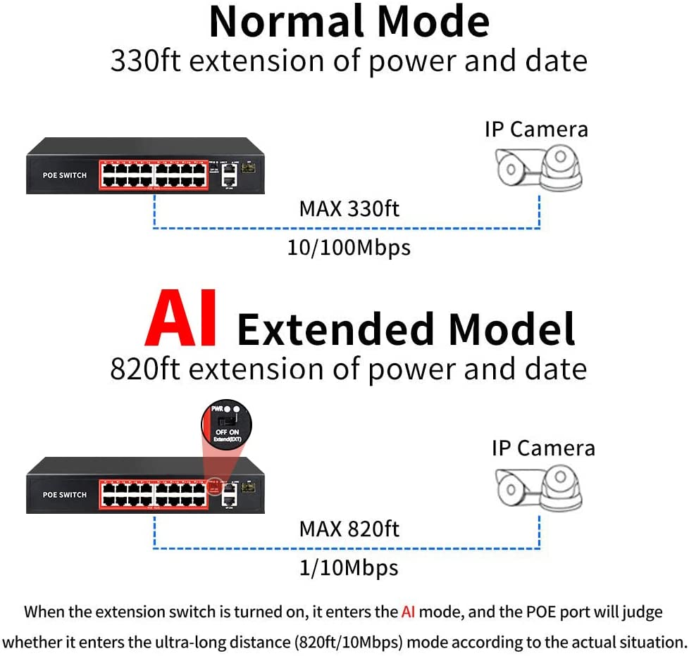 【AI 250 meters Extend function】Turn on the extension switch,it enters the AI mode,POE port will judge whether it enters the ultra-long distance (820ft/10Mbps) mode according to the actual situation).Extend function extending max power and data transmission distance from 100 meters(330ft) to 250 meters(820ft).which is easy to expand network via ethernet cable to somewhere without power supply but need fix device such as IP Cameras.