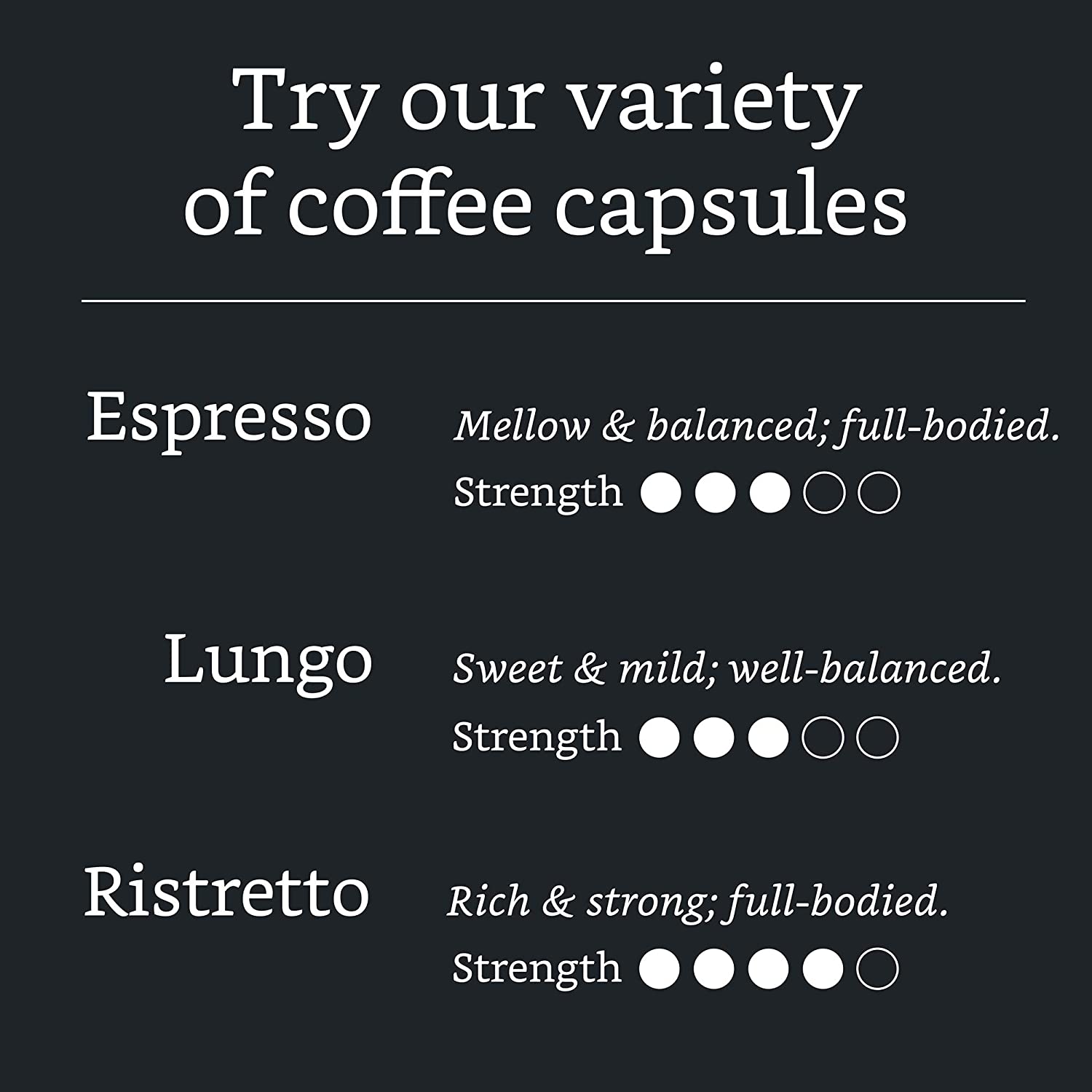 Mix of high-quality coffee beans, creating a genuine Italian Ristretto flavor with a sparkle of acidity and chocolate