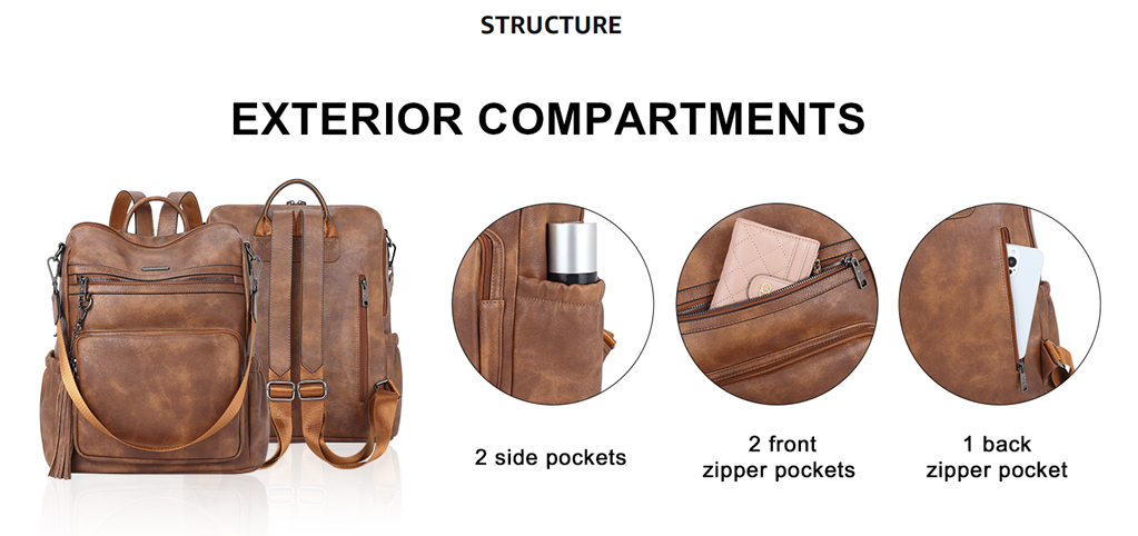 Multiple Compartments:1 main compartment with 2 inner zipper pockets, 2 inner slot pocket, 2 front zipper pockets, 2 side pockets and 1 back zipper pocket. Different sizes pockets are enough for you to hold your items like 14" or under laptop, iPad, A4 files, books, umbrella, sunglasses, cosmetics and other daily things, keeping them well organized.