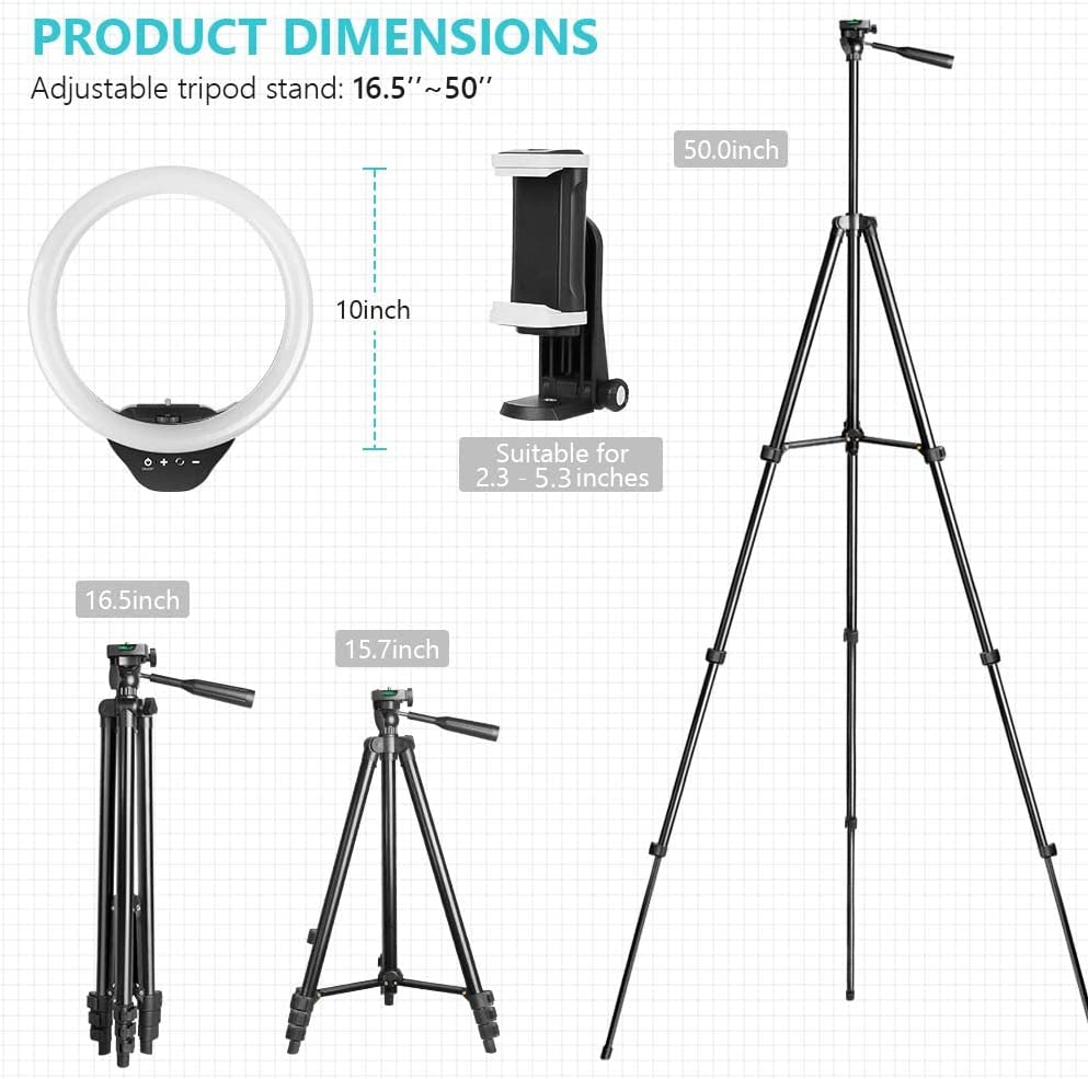 - 【Fully customizable portable tripod Stand】 Extending from 15.7 inches to 50 inches, our tripod can be adjusted to any height within seconds as needed, short enough to stand on tabletop, tall enough to fit your height. This compact circle light set comes handy when you do makeup, artworks, beauty & fashion live streaming, video calls and more.