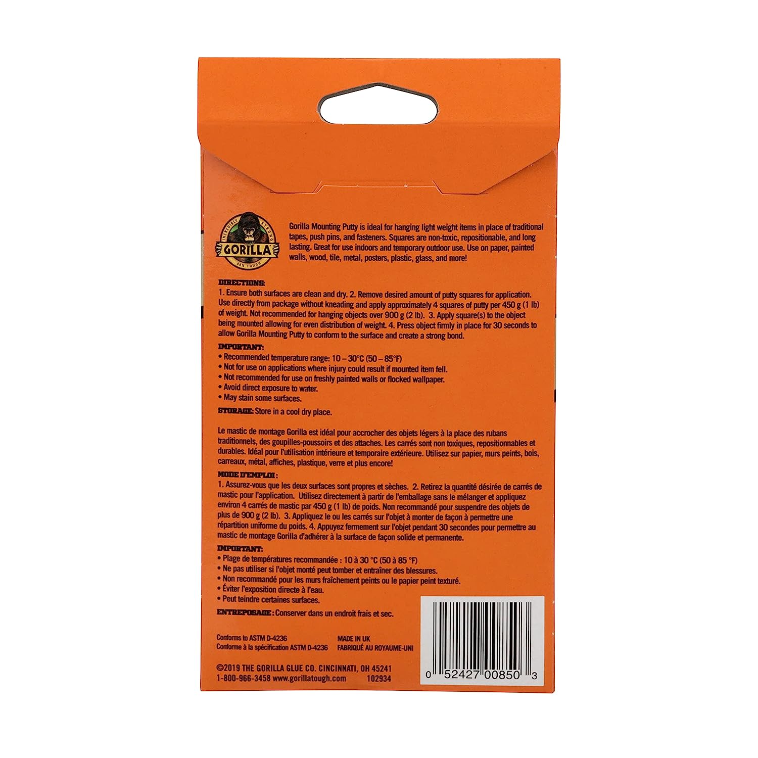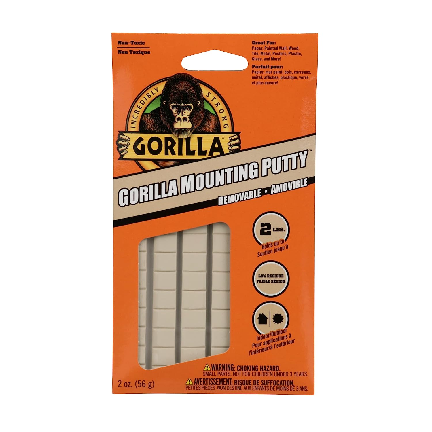 Gorilla Mounting Putty is ideal for hanging light weight items in place of traditional tapes, push pins, and fasteners. Squares are non-toxic, repositionable, and long lasting. Great for use indoors and temporary outdoor use. Use on paper, painted walls, wood, tile, metal, posters, plastic, glass, and more!