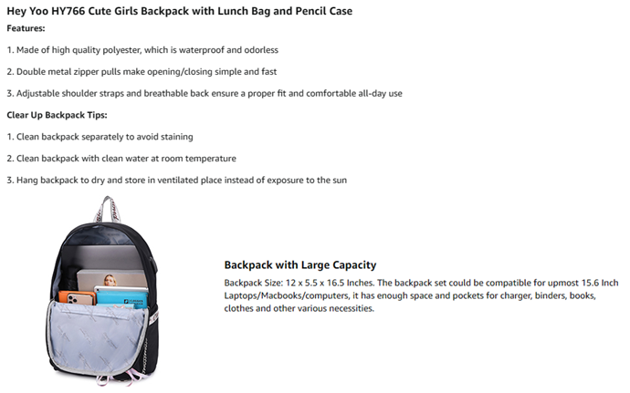 GIRLS SCHOOL BACKPACK: This cute backpack set is mainly made of durable and comfortable polyester, which is water splashing resistant and odorless. Smooth metal zippers, reinforced stitching and adjustable padded shoulder straps will increase the durability of backpack. The sturdy handle on the top for easily carrying.