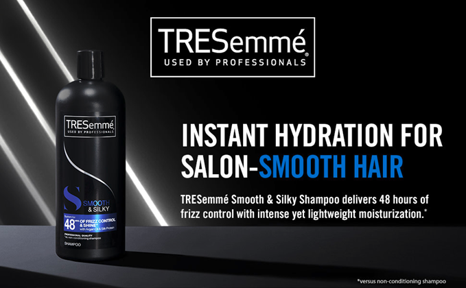 Want to restore moisture lost from heat styling? Try TRESemmé Smooth and Silky to quench dry hair and tame unruly hair. TRESemmé wants you to look and feel your best, which is why the TRESemmé Smooth and Silky System delivers optimized hydration that targets dryness and locks in moisture where your hair needs it most—every day. Enriched with Moroccan Argan oil, this gentle shampoo is designed to deliver optimum hydration that targets dryness and seals in moisture. The lightweight formula means you can turn dry, damaged hair into soft, manageable strands with beautiful shine. It’s also safe for colored hair. How to use the Smooth and Silky System: Step 1: Coat hair with a liberal amount of TRESemmé Smooth and Silky Shampoo. Step 2: Gently massage the scalp and roots with fingertips to work into a lather. Step 3: Lightly squeeze the shampoo from roots to ends and rinse thoroughly. Step 4: Apply an adequate amount of Smooth and Silky Conditioner from mid-shaft to ends. Step 5: Run a wide-tooth comb or fingers from roots to ends to detangle and fully coat hair. Leave for 2-3 minutes, then rinse thoroughly. Step 6: Finish with your favorite TRESemmé styling products as desired. Are you looking for a moisturizing shampoo for damaged hair? The clear choice is TRESemmé. Use TRESemmé Shampoo with TRESemmé's salon-quality hair styling products to perfect your look. These professional, salon-quality hair care products are deep conditioning hair products for dry hair without the salon price tag. TRESemmé Smooth and Silky Shampoo and Conditioner system delivers intense hydration that calms frizz and tames pesky flyaways, all while yielding up to 7x smoother hair, vs. non-conditioning shampoo. Ever since our origin in salons, TRESemmé has been driven by a simple truth: every woman deserves to look and feel their best, and that usually starts with a good hair day.