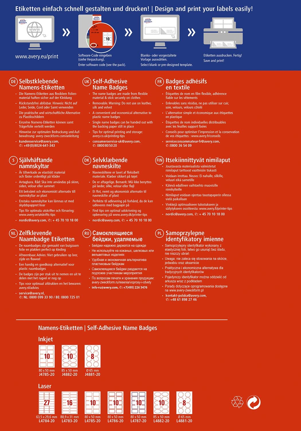 The self-adhesive, removable name labels J4881-20 for inkjet printers from Avery Zweckform in round format 65 mm make it easier to organise events, seminars and conferences (160 white name labels per pack). The name tags for clothing made of flexible film material adhere reliably to clothing and textiles and can be removed without leaving any residue. By the way: the name labels are also ideal for nurseries, in the private sector, e.g. at weddings or for marking fabrics, carpets and mattresses. The back punching of the name plate allows the name label to be separated and the carrier film for later use. The name labels offer a guaranteed jam free print flow on all standard inkjet printers. Design and print your name badges quickly and easily with the free Avery Zweckform label templates and software solutions. Please note that the name labels are not suitable for delicate fabrics such as leather, silk, velvet or cords. Damage to the fabrics cannot be ruled out. Features: Inkjet Dimensions: round, diameter 65 mm. Colour: white. Application: visitor management, events, meetings, fairs, name marking Ideal for: visitors, events, conferences, meetings, name labels, name labels, seminars, training and events