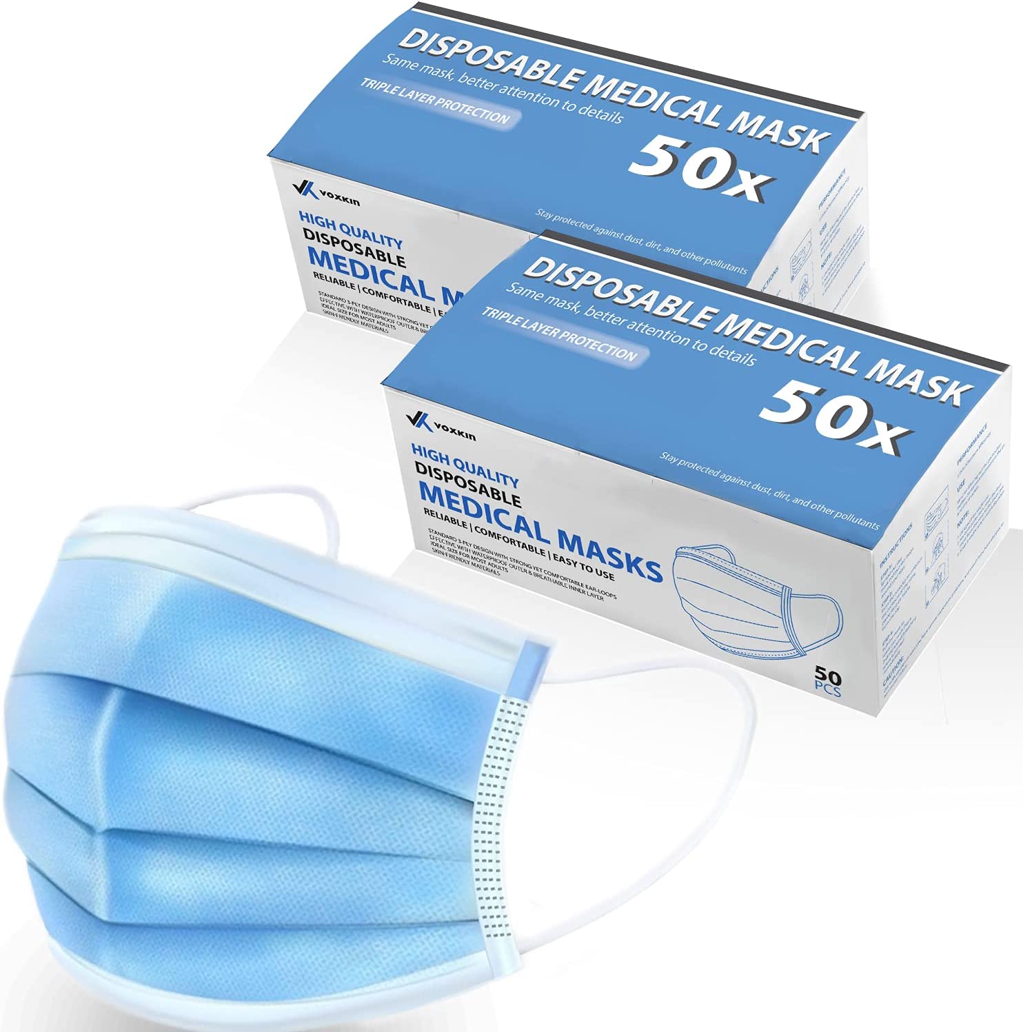 Voxkin Blue Disposable Medical Face Masks Pack of 50 - Lab Tested, 3 Ply Protection - Effective Filtration, Breathable Facial Masks with Earloop, Mouth & Nose Protection Dust Safety Masks