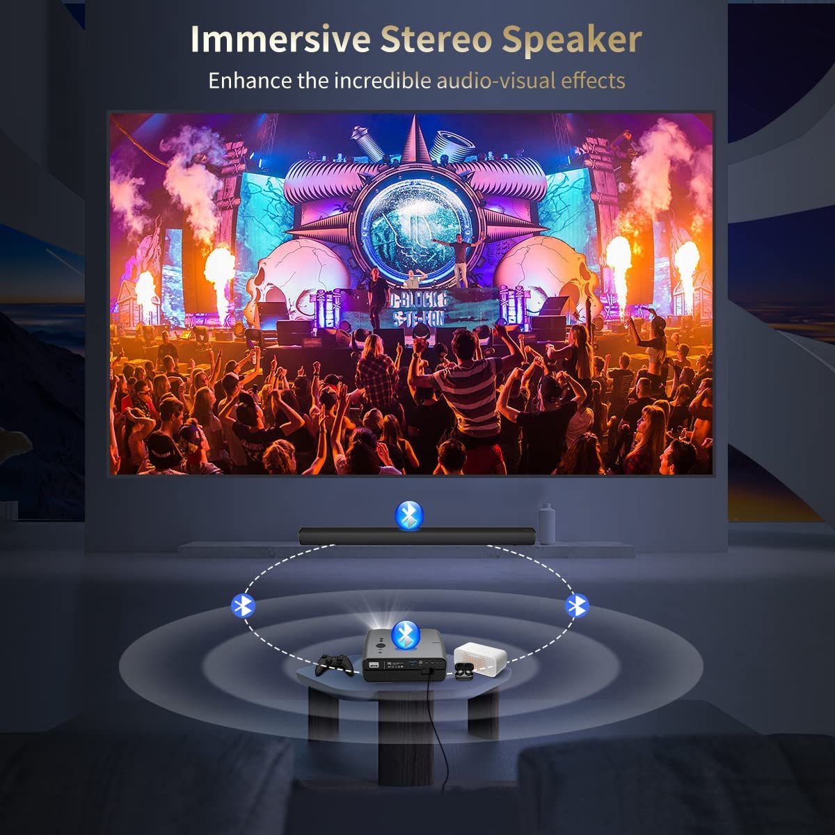 【Experience True-to-Life Picture Quality with Our Best-in-Class 4K Projector with Native 1920x1080p Resolution and 10,000 Lumens】It adopts 1080p physical resolution, 10,000:1 contrast, 90% NTSC, supports 4K inputs,empowers to sharper, and clearer images, for light-on viewing. 60% much better than other 1080p LCD projectors. 300'' pictures, professional15W hifi speakers, directly reduplicate cinema enjoyment. So ready to impress you with SPECTACULAR colors, and RICH details, scene by scene.
