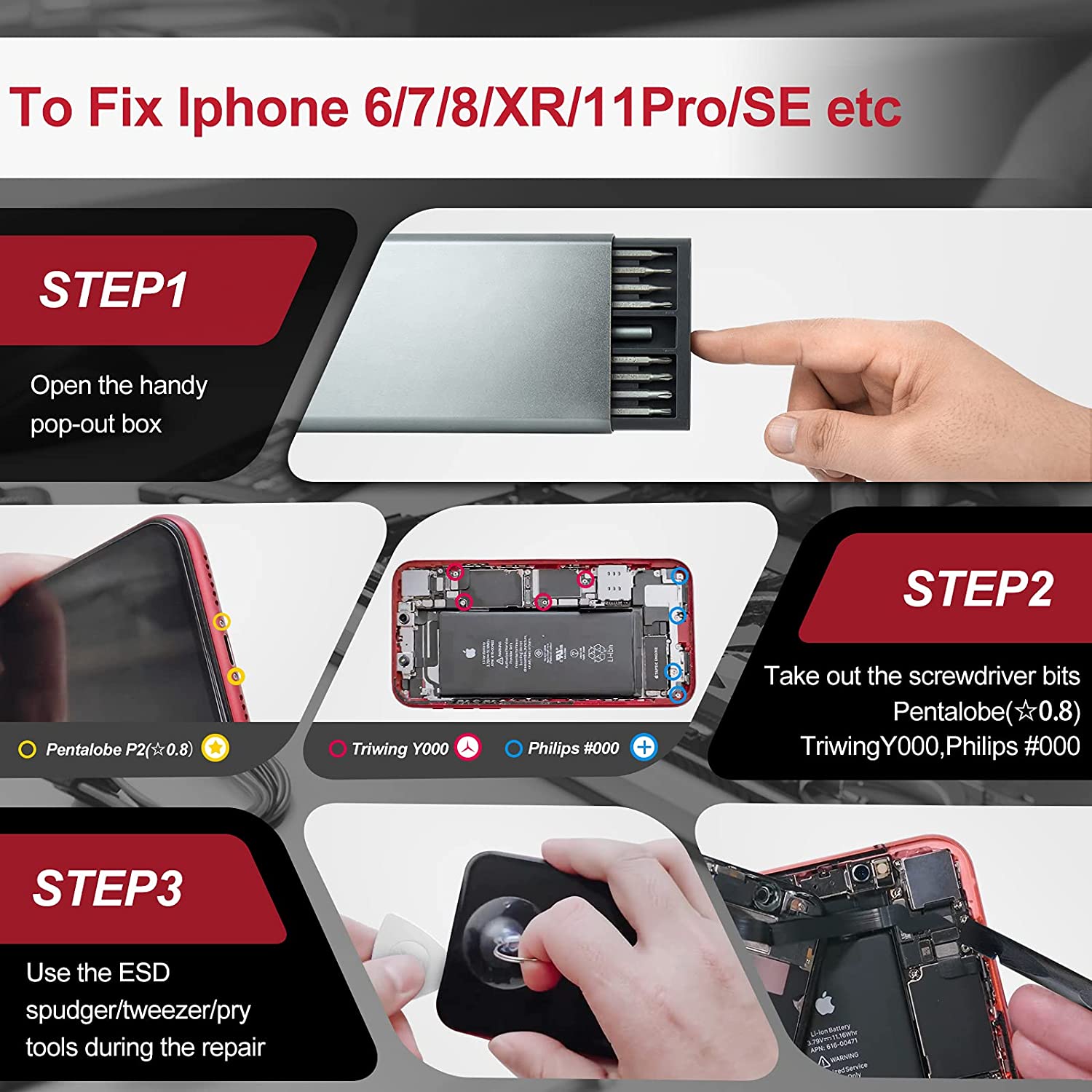 【DURABILITY & ACCURACY】The precision screwdriver kit contains 62pcs varies driver bits, made of CRV steel with tip hardness HRC56-60,wear-resistant and accurate; it covers standard screwdrivers flathead,hex,phillips,triangle,square. also inclus exotic bits pentalobe(star),triwing,torx,security torx to repair Apple iPhone 4,5,6,7,8,8 Plus,X,Xs Max,XR,11,11 Pro,SE,MacBook,and even game bits for nintendo. can perfectly tackle your electronics repairs or home/office DIY projects
