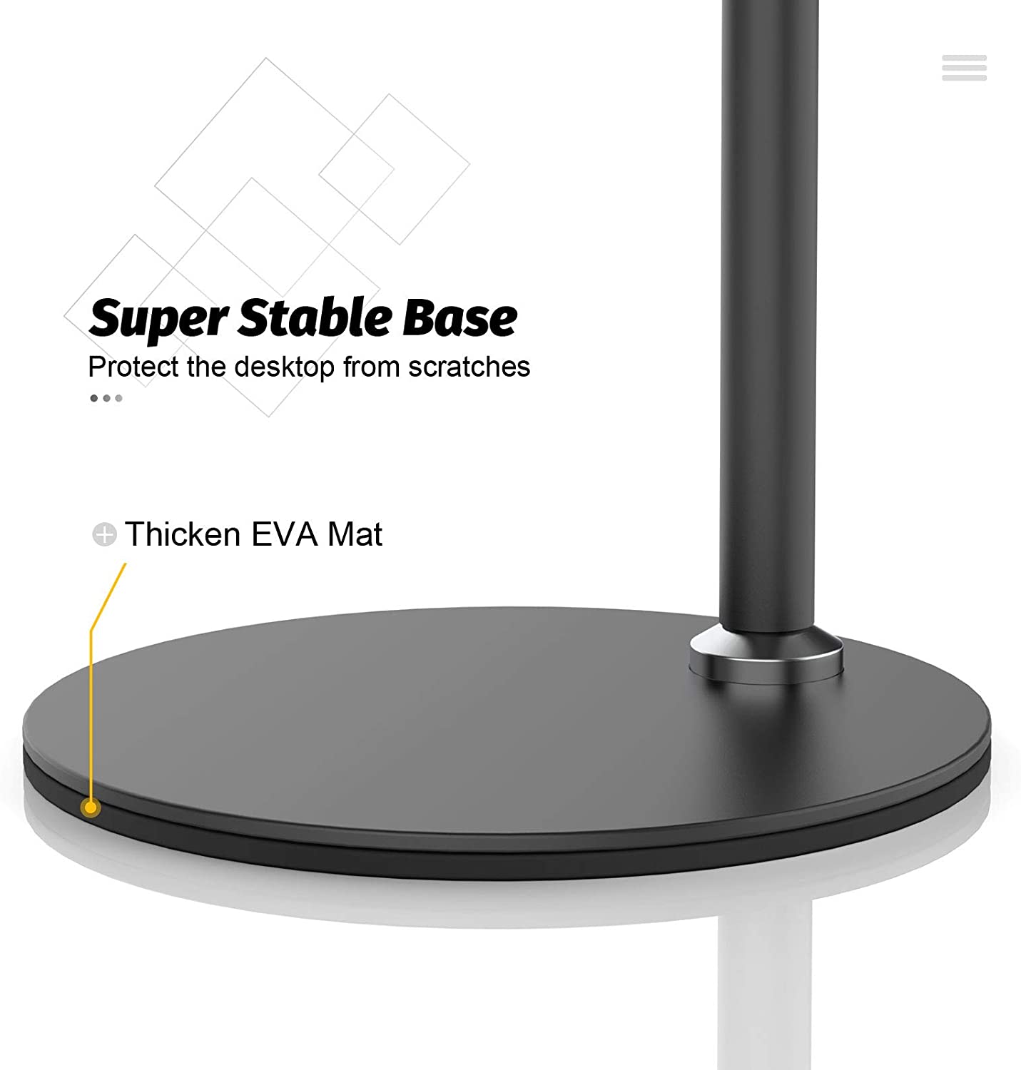 • ? 【 Weighted Metal Base 】: As to ensure the stability of the phone holder, the base of this phone stand is made of weighted excellent metal. The package of stand have a same size of thicken EVA mat with the base, paste in the bottom, can increase the stability of the stand and anti-slip, but also can better protect the desktop from scratches.