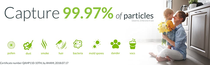 Includes a 99. 97Percent efficient true HEPA, capturing particles to 0. 3microns
