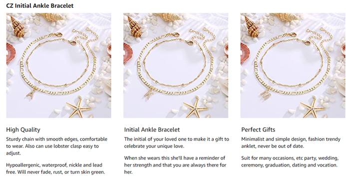 Features:Color: goldSize: 8.5"+2”extenderMaterial: 14k gold platedItem Specification:Package include: packs each delicate initial ankle set with a velvet bag.Care Tips for your Jewelry:*Keep your initial ankle bracelet away from harsh chemicals.*Avoid your initial ankle bracelet impacting on any hard substances.*It is best to store your initial ankle bracelet separately.*When taking off initial ankle bracelet, you can place it inside the velvet bag and then put in a safe space.