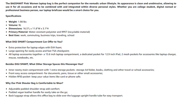 • SPECIFICATIONS- 16.5"L x 11.8"H x 3.1"W; weight: 1.98 lbs; can use as a laptop shoulder bag; business briefcase for women