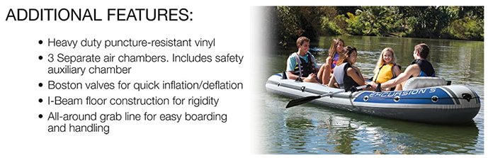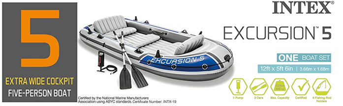 | Included Components | Intex Excursion 5, All-Around Grab Line, 5-Person Inflatable Boat Set With Aluminum Oars And High Output Air Pump, U.S. Coast Guard I.D, Repair Patch, Gear Pouch, Storage Duffel Bag |