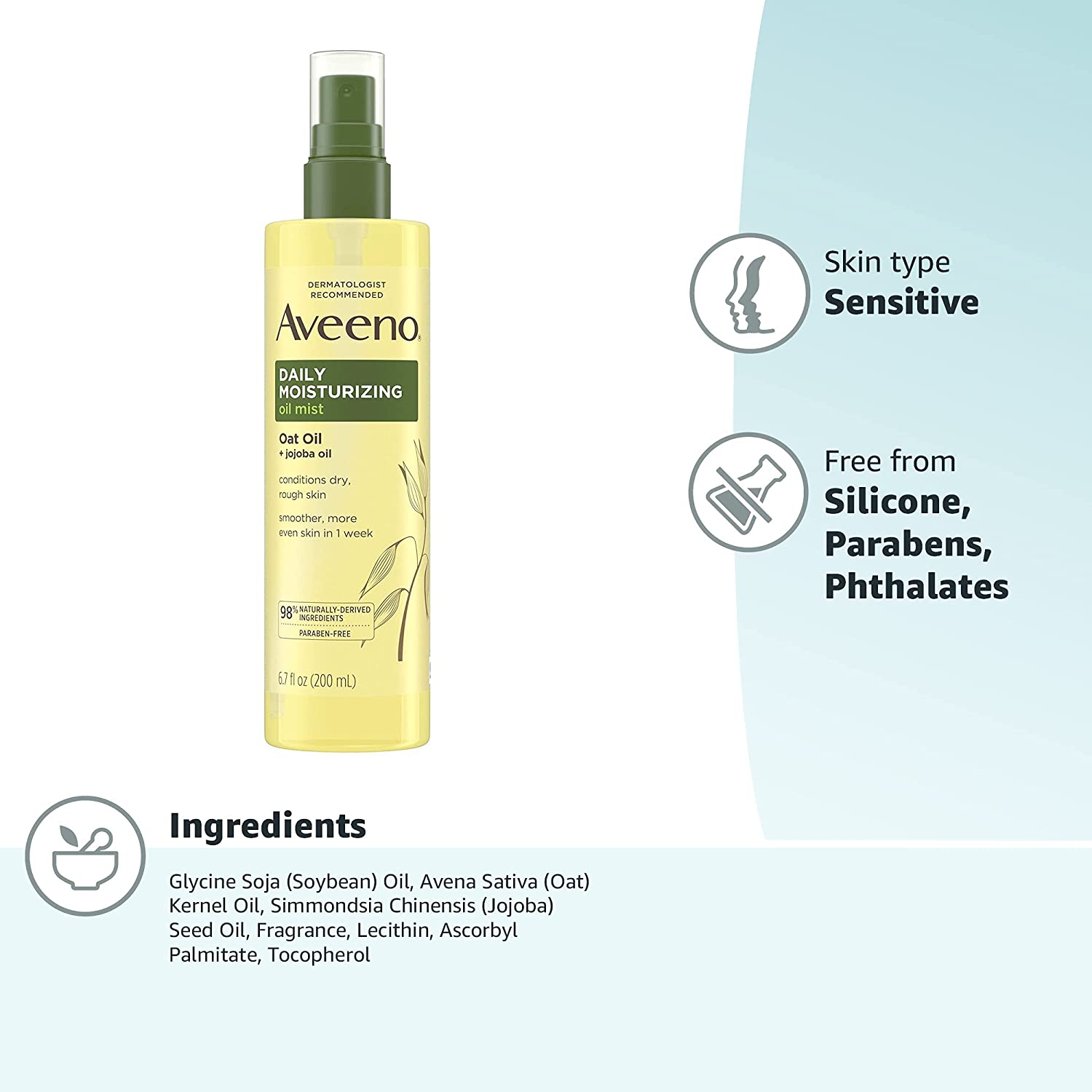 Condition and nourish your skin with Aveeno Daily Moisturizing Dry Oil Mist. Ideal for sensitive skin care, this body oil spray immediately moisturizes dry, rough skin; 92% of testers agree that skin instantly looks smoother and more even after application. From a dermatologist-recommended skincare brand for over 65 years, this daily moisturizing body oil is formulated with 98% naturally derived ingredients including oat oil, which is rich in lipids and fatty acids to help condition skin, and jojoba oil, which contains up to twice as much vitamin E as shea butter. This moisturizing body oil spray is hypoallergenic and free of parabens, phthalates, silicones, mineral oil, synthetic dyes and alcohol. Use daily as part of your regular at-home skincare routine by spraying the dry oil mist close to your skin and massaging it in. Do not spray the oil near eyes or face.