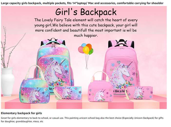 Size: Unicorn Girls preschool backpack Approx 18"Hx6.3"Dx11.8"L; compatible for a laptop up to 15". Lunch tote Bag Approx 10.5"x7.8"x7.08". Pencil case: Approx 8.8"Lx4.3"D, fit for 3-12 Ages girls.