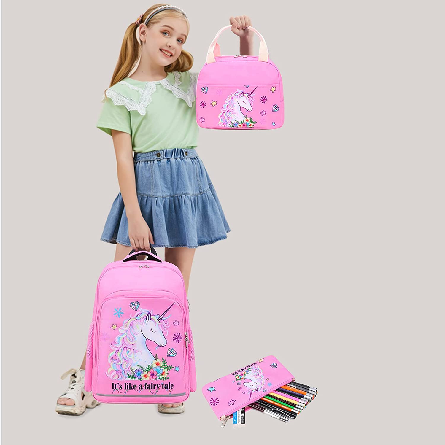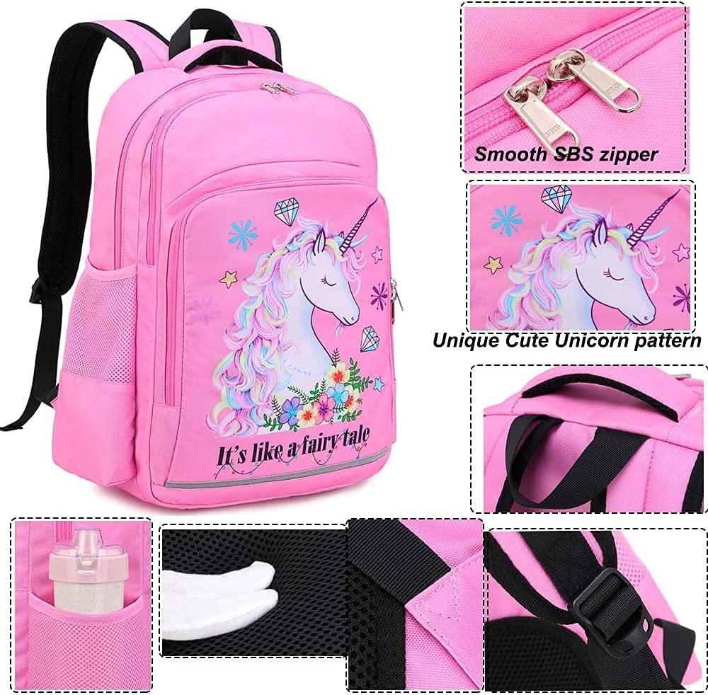 Material: This girl unicorn backpack is well made of high quality and durable Oxford with fairy tale unicorn printing, it would not fade. The 3 IN 1 kindergarten backpack set include girls Backpack + Insulated lunch tote Bag + Pencil pouch also as purse, perfect for girls to use at school days.