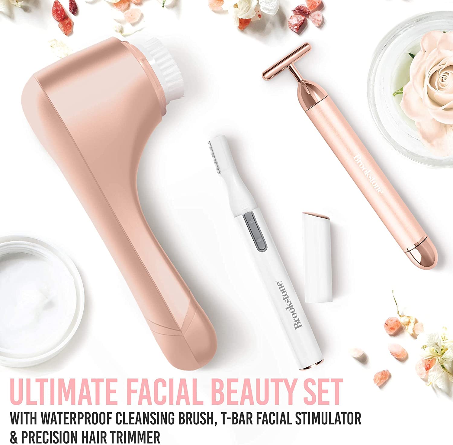 Brookstone 3-in-1 Rose Gold Facial Skin Care Set | Facial Skin Care Products Include Facial Cleansing Brush, T-Bar Face Massager and Facial Epilator | Perfect Gift