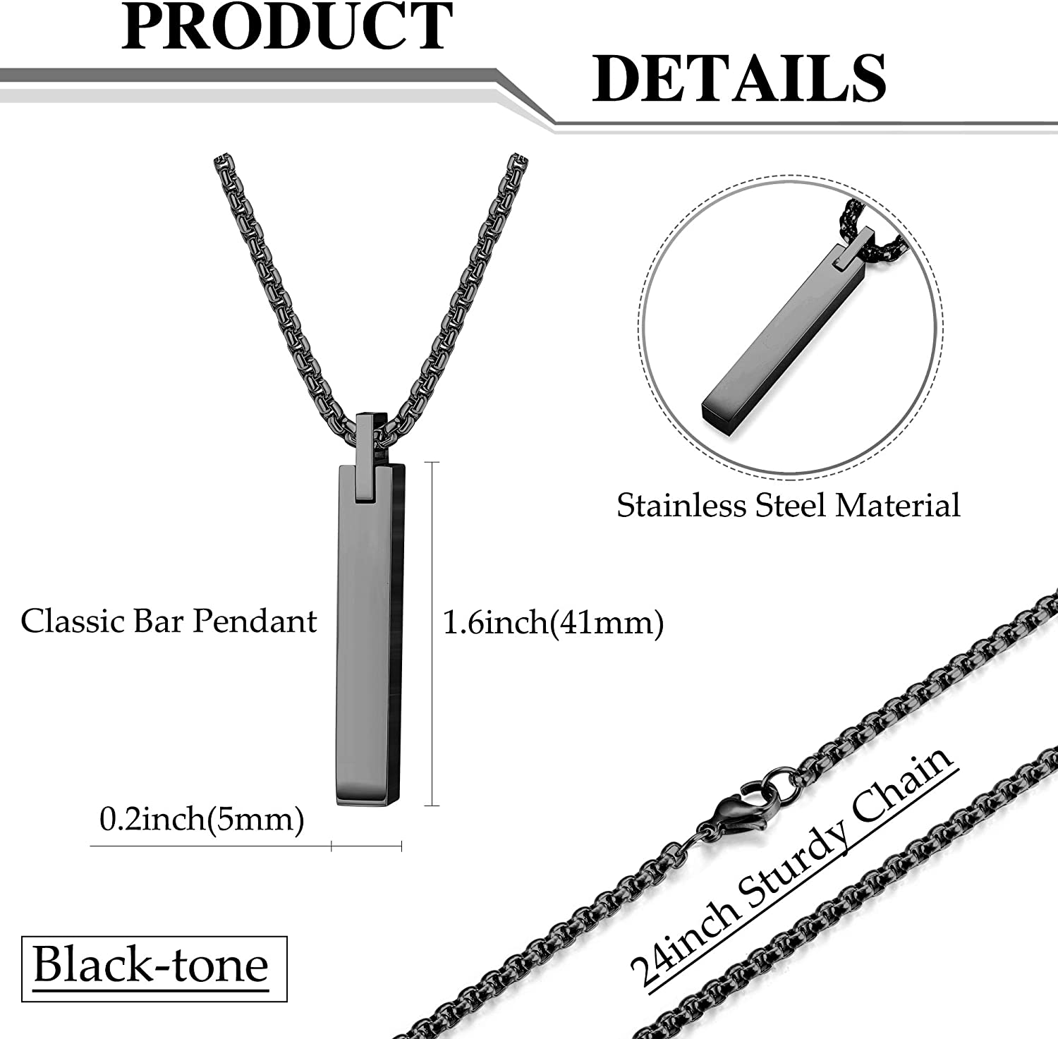 PRODUCT SIZE--Thick Bar Pendants Size: length: 40mm,width: 5.8mm,thick:5.8mm; Twisted Cube Bar Pendant Size: length: 40mm,width: 3.6mm,thick:4.6mm;All Come with a 3mm 24 inch chain. Perfect size for men and women