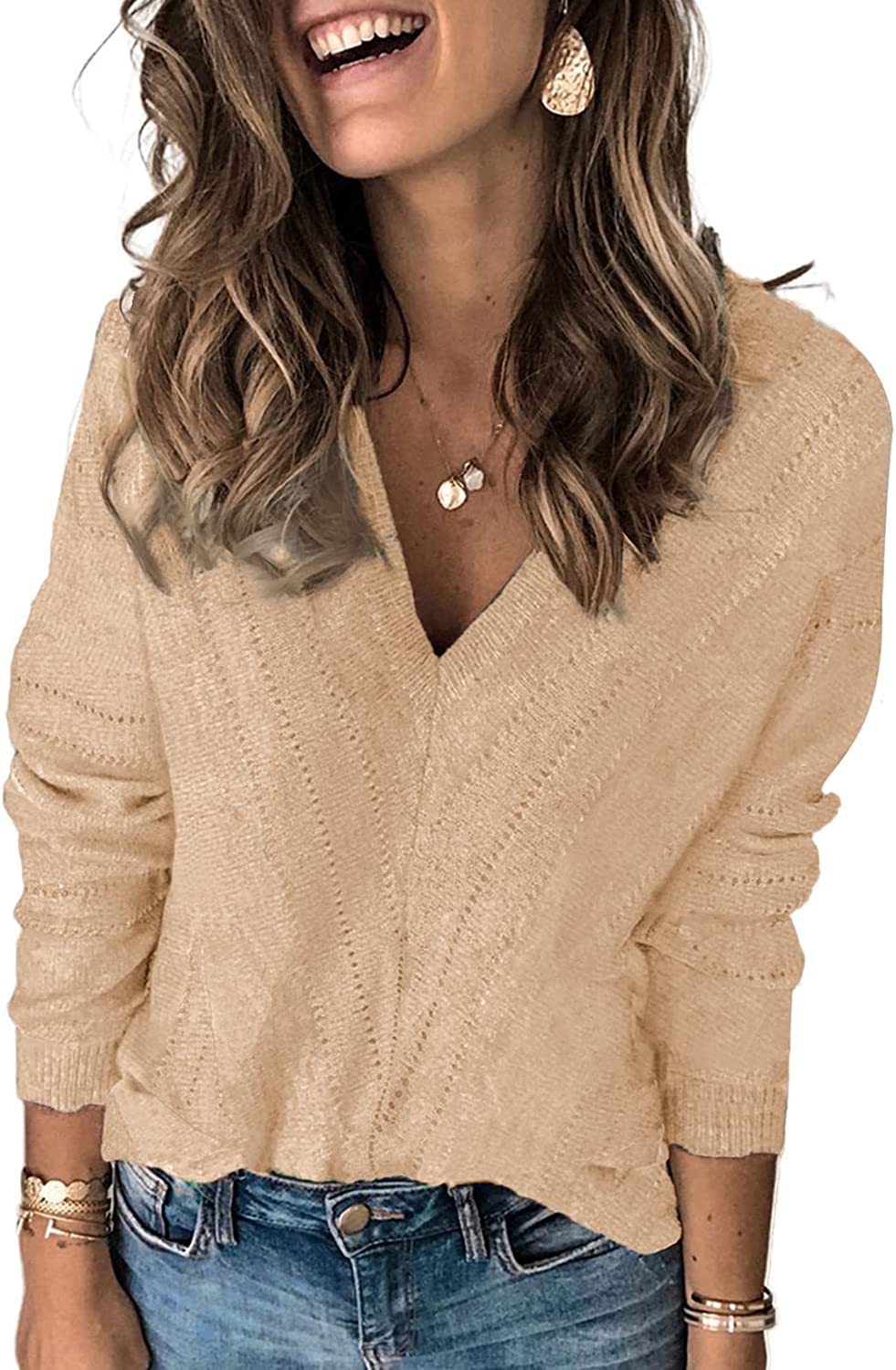 Elapsy Womens Color Block Striped V Neck Sweater Long Sleeve Pullover Knitted Sweater XS-2XL