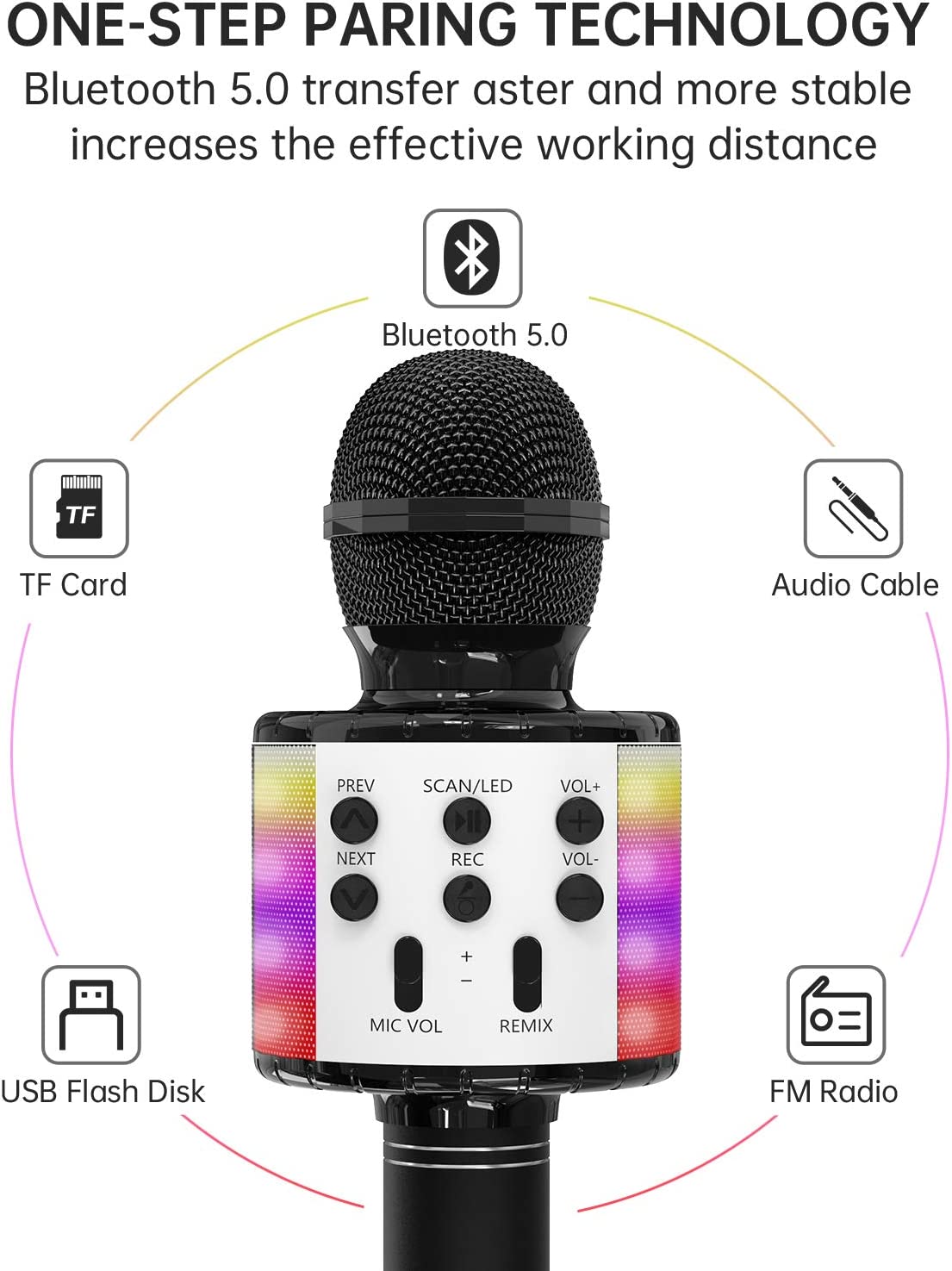 • 【Great Gifts】The karaoke microphone has a stylish appearance. The lighting beats with the rhythm of the music, perfectly creating a pleasant and romantic atmosphere for you. With this microphone, everywhere is the stage. Let your kids start their little solo concert now. Say goodbye to wired microphone tangles and say hello to the freedom of movement! It is a great birthday or festival gift for your kids, friends, or family.