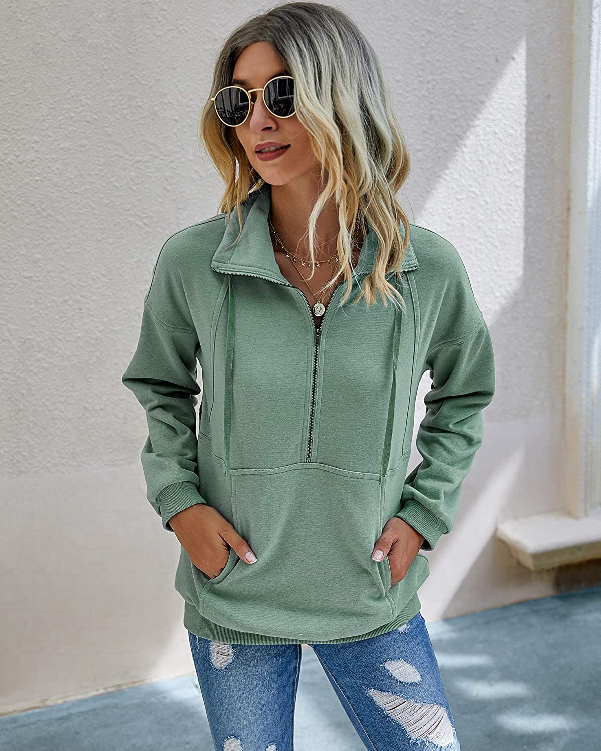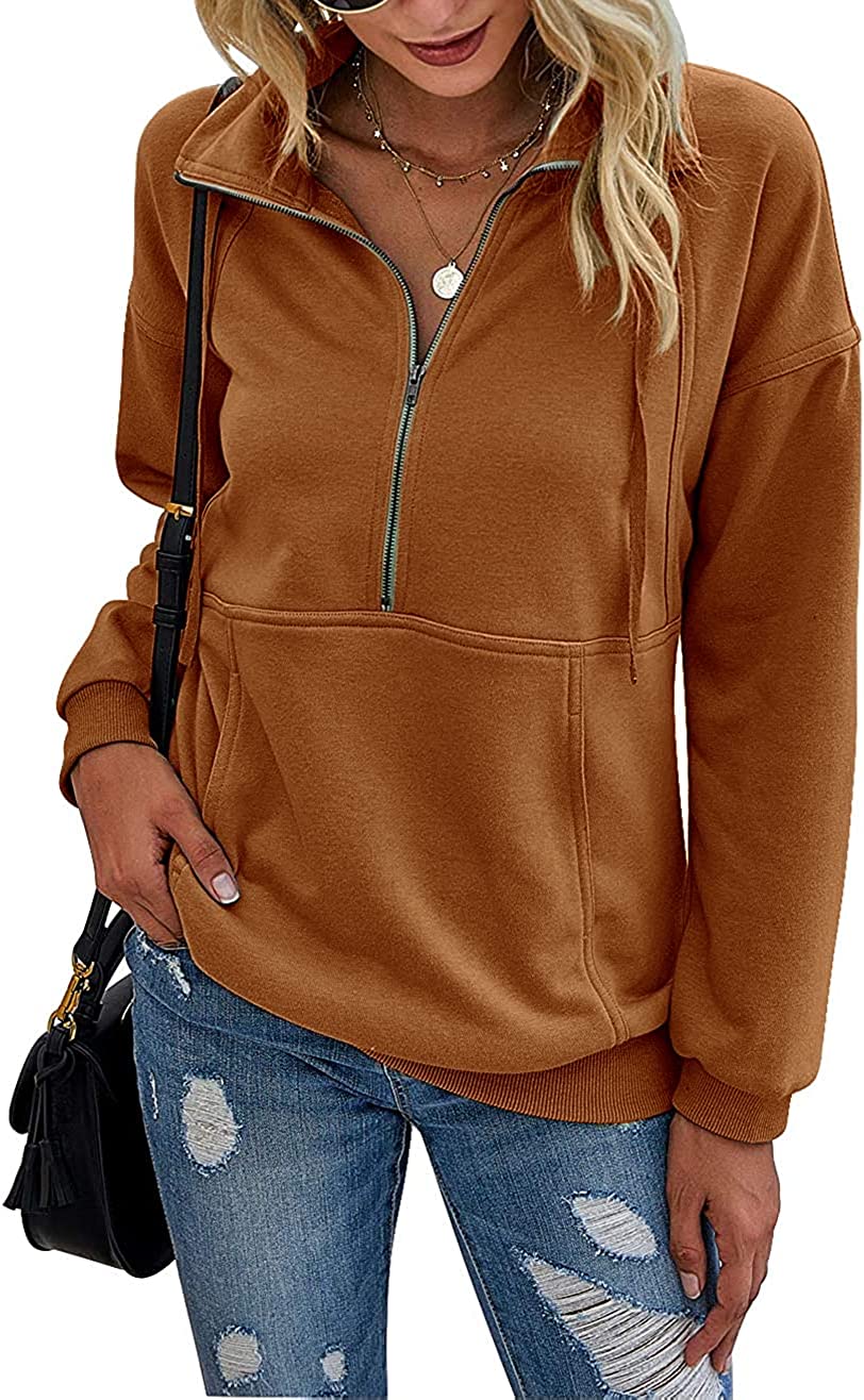 • Versatile Half Zip Pullover Women: Drawstring lapel womens sweatshirt in solid color is simple yet fashion. Half zipper womens sweatshirts no hood are easy to put on and take off. Relaxed fit plain cute sweatshirts for women can be dresses up or down, perfect with leggings, jeans or shorts